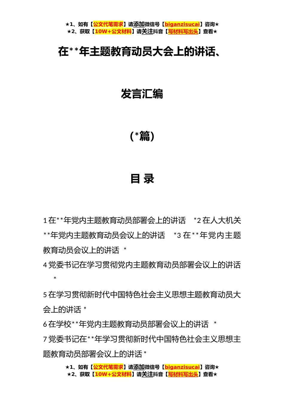 ★1、如有【公文代笔需求】请添加微信号【biganzisucai】咨询★★2、获取【10W+公文材料】请关注抖音【写材料写出头】查看★在**年主题教育动员大会上的讲话、发言汇编(*篇)目录1在**年党内主题教育动员部署会上的讲话*2在人大机关**年党内主题教育动员会议上的讲话*3在**年党内主题教育动员会议上的讲话*4党委书记在学习贯彻党内主题教育动员部署会议上的讲话*5在学习贯彻新时代中国特色社会主义思想主题教育动员大会上的讲话*6在学校**年党内主题教育动员部署会议上的讲话*7党委书记在**年学习贯彻新时代中国特色社会主义思想主题教育动员部署会议上的讲话*★1、如有【公文代笔需求】请添加微信号【biganzisucai】咨询★★2、获取【10W+公文材料】请关注抖音【写材料写出头】查看★★1、如有【公文代笔需求】...
