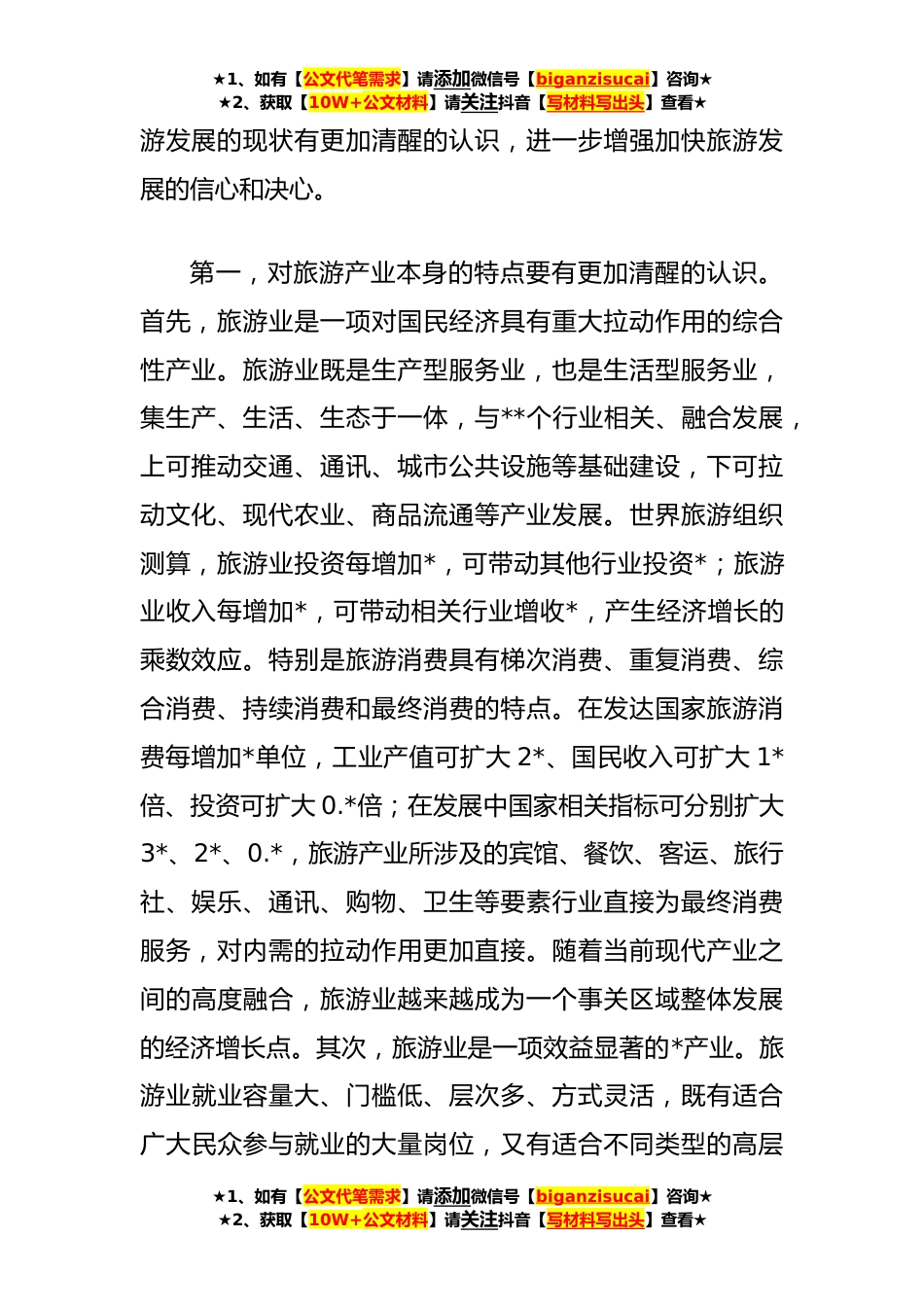 ★1、如有【公文代笔需求】请添加微信号【biganzisucai】咨询★★2、获取【10W+公文材料】请关注抖音【写材料写出头】查看★在X县旅游产业发展大会上的讲话同志们:县委、县政府召开如此高规格、大规模的全县旅游产业发展大会,其目的是深入贯彻落实全省旅游产业发展推进会议精神,科学研判、积极顺应旅游发展新形势,动员全县上下进一步*思想、明确目标,强化举措、真抓实干,加快推动全县旅游产业发展再上新台阶,全力打造X旅游升级版。下面,我再强调三点意见。一、认清形势、凝聚共识,切实把加快旅游发展摆到更加突出的位置当前,国际国内旅游正处于大发展、大调整的重要时期,X也正处于加快旅游产业做大总量、做优质量的关键时期。无论是从旅游业的自身特点还是发展趋势,无论是从X旅游业所处的发展阶段还是...