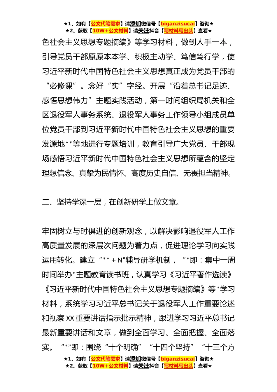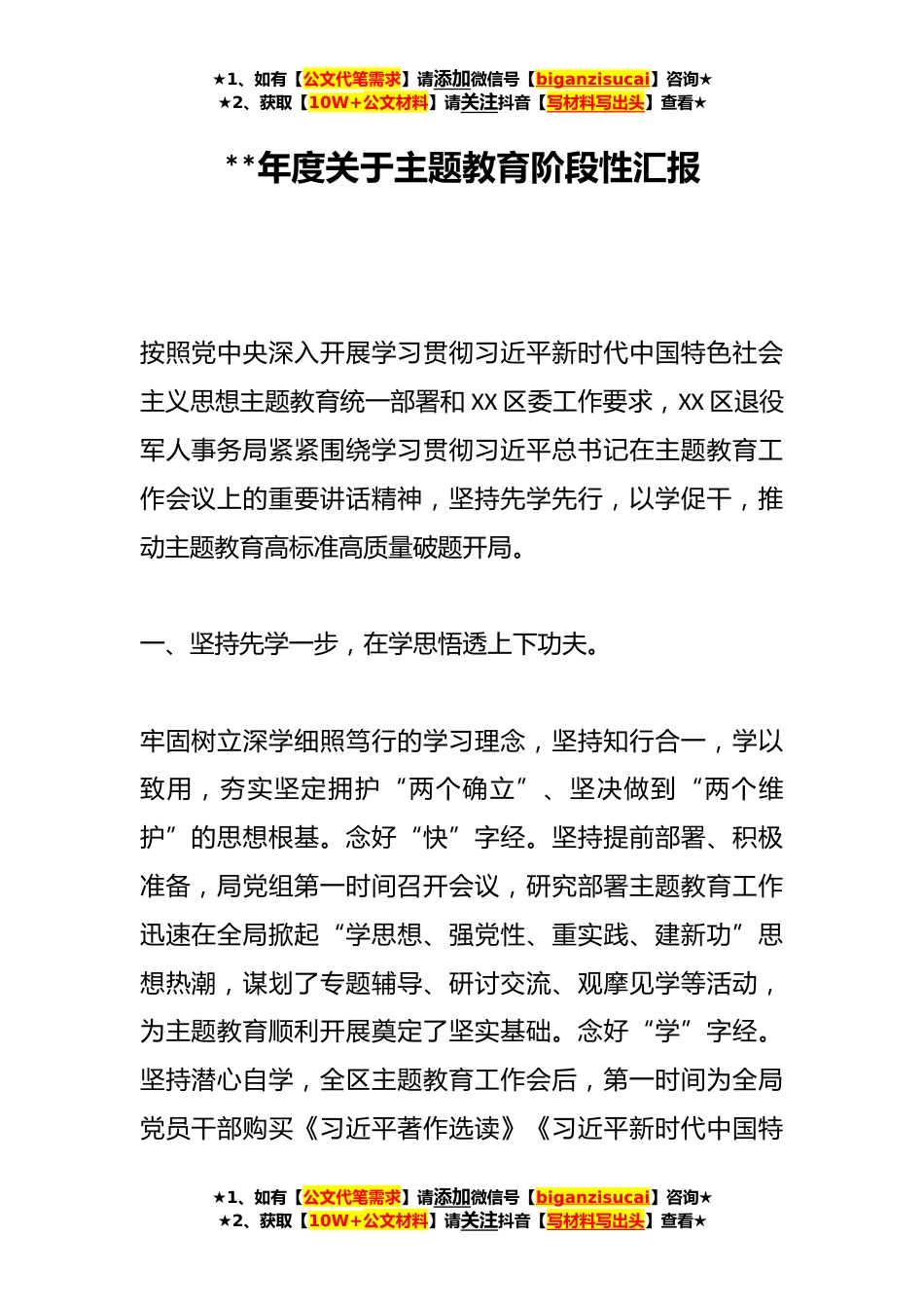 ★1、如有【公文代笔需求】请添加微信号【biganzisucai】咨询★★2、获取【10W+公文材料】请关注抖音【写材料写出头】查看★**年度关于主题教育阶段性汇报按照党中央深入开展学习贯彻习近平新时代中国特色社会主义思想主题教育统一部署和XX区委工作要求,XX区退役军人事务局紧紧围绕学习贯彻习近平总书记在主题教育工作会议上的重要讲话精神,坚持先学先行,以学促干,推动主题教育高标准高质量破题开局。一、坚持先学一步,在学思悟透上下功夫。牢固树立深学细照笃行的学习理念,坚持知行合一,学以致用,夯实坚定拥护“两个确立”、坚决做到“两个维护”的思想根基。念好“快”字经。坚持提前部署、积极准备,局党组第一时间召开会议,研究部署主题教育工作迅速在全局掀起“学思想、强党性、重实践、建新功”思...