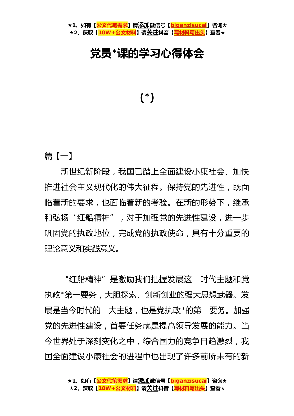 ★1、如有【公文代笔需求】请添加微信号【biganzisucai】咨询★★2、获取【10W+公文材料】请关注抖音【写材料写出头】查看★党员*课的学习心得体会(*)篇【一】新世纪新阶段,我国已踏上全面建设小康社会、加快推进社会主义现代化的伟大征程。保持党的先进性,既面临着新的要求,也面临着新的考验。在新的形势下,继承和弘扬“红船精神”,对于加强党的先进性建设,进一步巩固党的执政地位,完成党的执政使命,具有十分重要的理论意义和实践意义。“红船精神”是激励我们把握发展这一时代主题和党执政*第一要务,大胆探索、创新创业的强大思想武器。发展是当今时代的一大主题,也是党执政*的第一要务。加强党的先进性建设,首要任务就是提高领导发展的能力。当今世界处于深刻变化之中,综合国力的竞争日趋激烈,...
