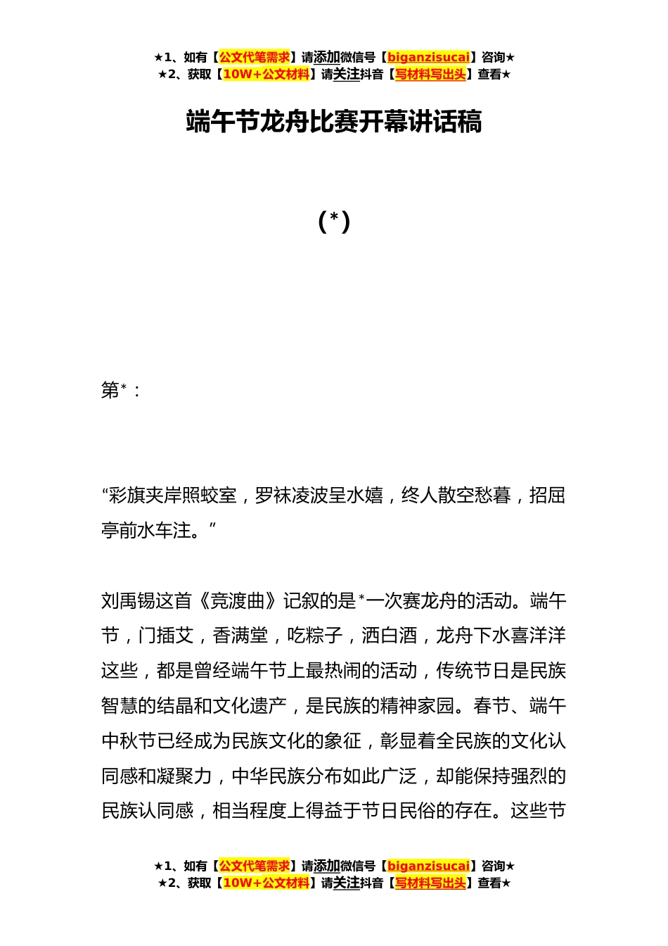 ★1、如有【公文代笔需求】请添加微信号【biganzisucai】咨询★★2、获取【10W+公文材料】请关注抖音【写材料写出头】查看★端午节龙舟比赛开幕讲话稿(*)第*:“彩旗夹岸照蛟室,罗袜凌波呈水嬉,终人散空愁暮,招屈亭前水车注。”刘禹锡这首《竞渡曲》记叙的是*一次赛龙舟的活动。端午节,门插艾,香满堂,吃粽子,洒白酒,龙舟下水喜洋洋这些,都是曾经端午节上最热闹的活动,传统节日是民族智慧的结晶和文化遗产,是民族的精神家园。春节、端午中秋节已经成为民族文化的象征,彰显着全民族的文化认同感和凝聚力,中华民族分布如此广泛,却能保持强烈的民族认同感,相当程度上得益于节日民俗的存在。这些节★1、如有【公文代笔需求】请添加微信号【biganzisucai】咨询★★2、获取【10W+公文材料】请关注抖音【...