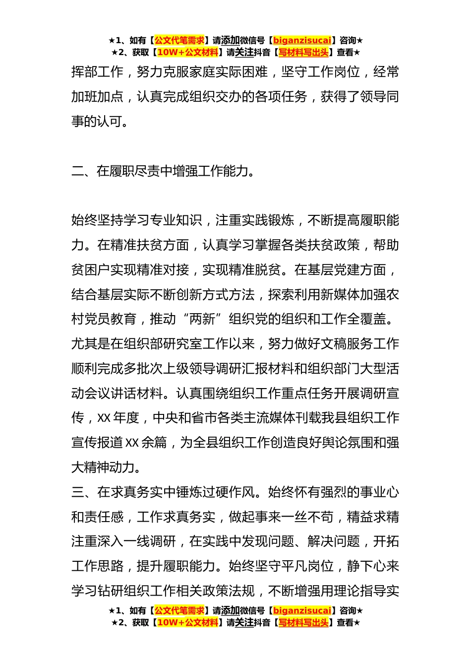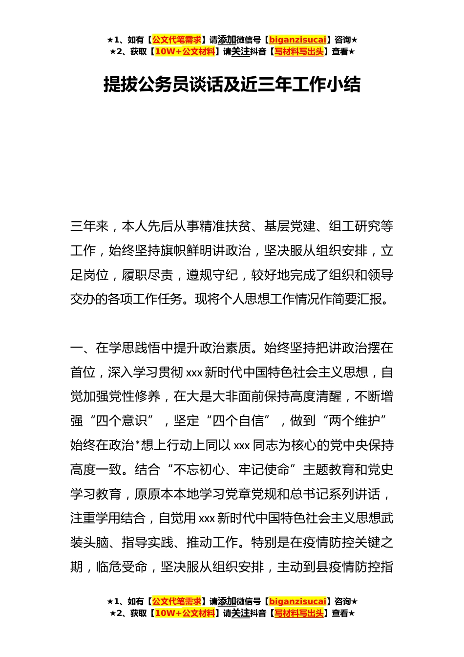 ★1、如有【公文代笔需求】请添加微信号【biganzisucai】咨询★★2、获取【10W+公文材料】请关注抖音【写材料写出头】查看★提拔公务员谈话及近三年工作小结三年来,本人先后从事精准扶贫、基层党建、组工研究等工作,始终坚持旗帜鲜明讲政治,坚决服从组织安排,立足岗位,履职尽责,遵规守纪,较好地完成了组织和领导交办的各项工作任务。现将个人思想工作情况作简要汇报。一、在学思践悟中提升政治素质。始终坚持把讲政治摆在首位,深入学习贯彻xxx新时代中国特色社会主义思想,自觉加强党性修养,在大是大非面前保持高度清醒,不断增强“四个意识”,坚定“四个自信”,做到“两个维护”始终在政治*想上行动上同以xxx同志为核心的党中央保持高度一致。结合“不忘初心、牢记使命”主题教育和党史学习教育,原原...