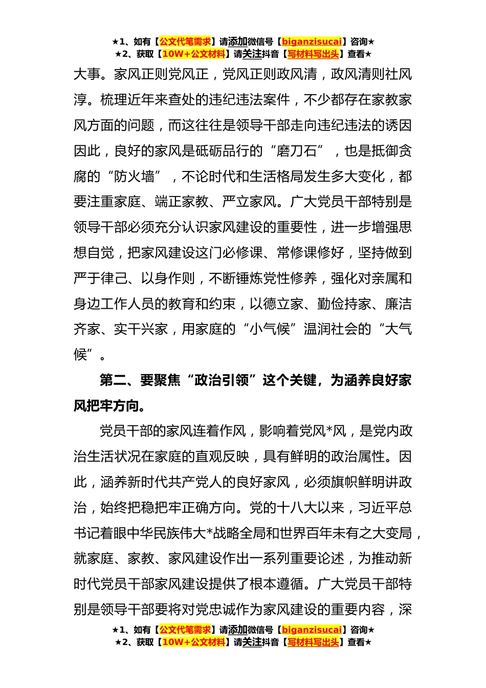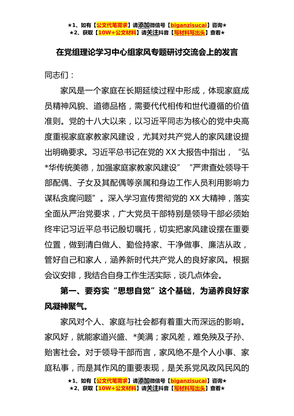 ★1、如有【公文代笔需求】请添加微信号【biganzisucai】咨询★★2、获取【10W+公文材料】请关注抖音【写材料写出头】查看★在党组理论学习中心组家风专题研讨交流会上的发言同志们:家风是一个家庭在长期延续过程中形成,体现家庭成员精神风貌、道德品格,需要代代相传和世代遵循的价值准则。党的十八大以来,以习近平同志为核心的党中央高度重视家庭家教家风建设,尤其对共产党人的家风建设提出明确要求。习近平总书记在党的XX大报告中指出,“弘*华传统美德,加强家庭家教家风建设”“严肃查处领导干部配偶、子女及其配偶等亲属和身边工作人员利用影响力谋私贪腐问题”。深入学习宣传贯彻党的XX大精神,落实全面从严治党要求,广大党员干部特别是领导干部必须始终牢记习近平总书记殷切嘱托,切实把家风建设摆在...