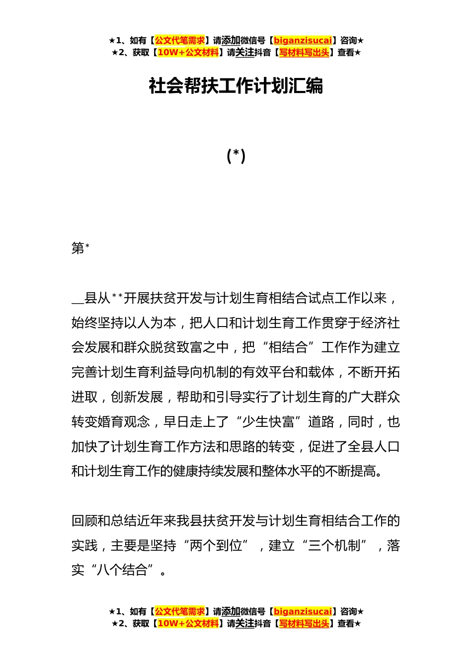 ★1、如有【公文代笔需求】请添加微信号【biganzisucai】咨询★★2、获取【10W+公文材料】请关注抖音【写材料写出头】查看★社会帮扶工作计划汇编(*)第*__县从**开展扶贫开发与计划生育相结合试点工作以来,始终坚持以人为本,把人口和计划生育工作贯穿于经济社会发展和群众脱贫致富之中,把“相结合”工作作为建立完善计划生育利益导向机制的有效平台和载体,不断开拓进取,创新发展,帮助和引导实行了计划生育的广大群众转变婚育观念,早日走上了“少生快富”道路,同时,也加快了计划生育工作方法和思路的转变,促进了全县人口和计划生育工作的健康持续发展和整体水平的不断提高。回顾和总结近年来我县扶贫开发与计划生育相结合工作的实践,主要是坚持“两个到位”,建立“三个机制”,落实“八个结合”。★1、...