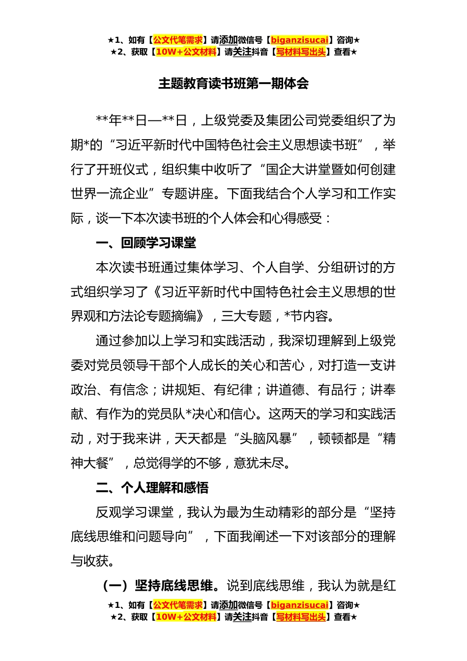 ★1、如有【公文代笔需求】请添加微信号【biganzisucai】咨询★★2、获取【10W+公文材料】请关注抖音【写材料写出头】查看★主题教育读书班第一期体会**年**日—**日,上级党委及集团公司党委组织了为期*的“习近平新时代中国特色社会主义思想读书班”,举行了开班仪式,组织集中收听了“国企大讲堂暨如何创建世界一流企业”专题讲座。下面我结合个人学习和工作实际,谈一下本次读书班的个人体会和心得感受:一、回顾学习课堂本次读书班通过集体学习、个人自学、分组研讨的方式组织学习了《习近平新时代中国特色社会主义思想的世界观和方法论专题摘编》,三大专题,*节内容。通过参加以上学习和实践活动,我深切理解到上级党委对党员领导干部个人成长的关心和苦心,对打造一支讲政治、有信念;讲规矩、有纪律;讲...