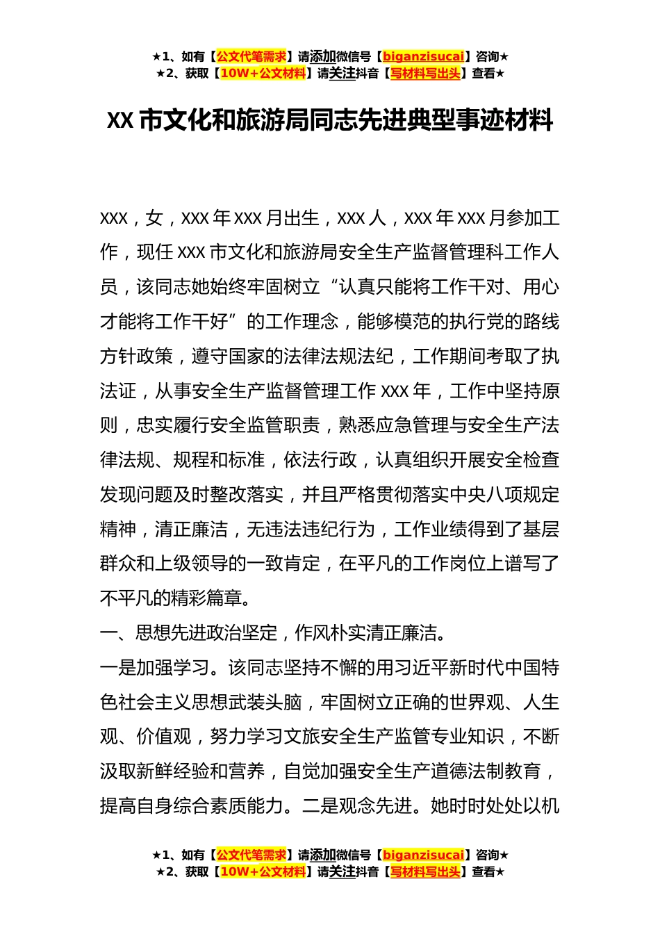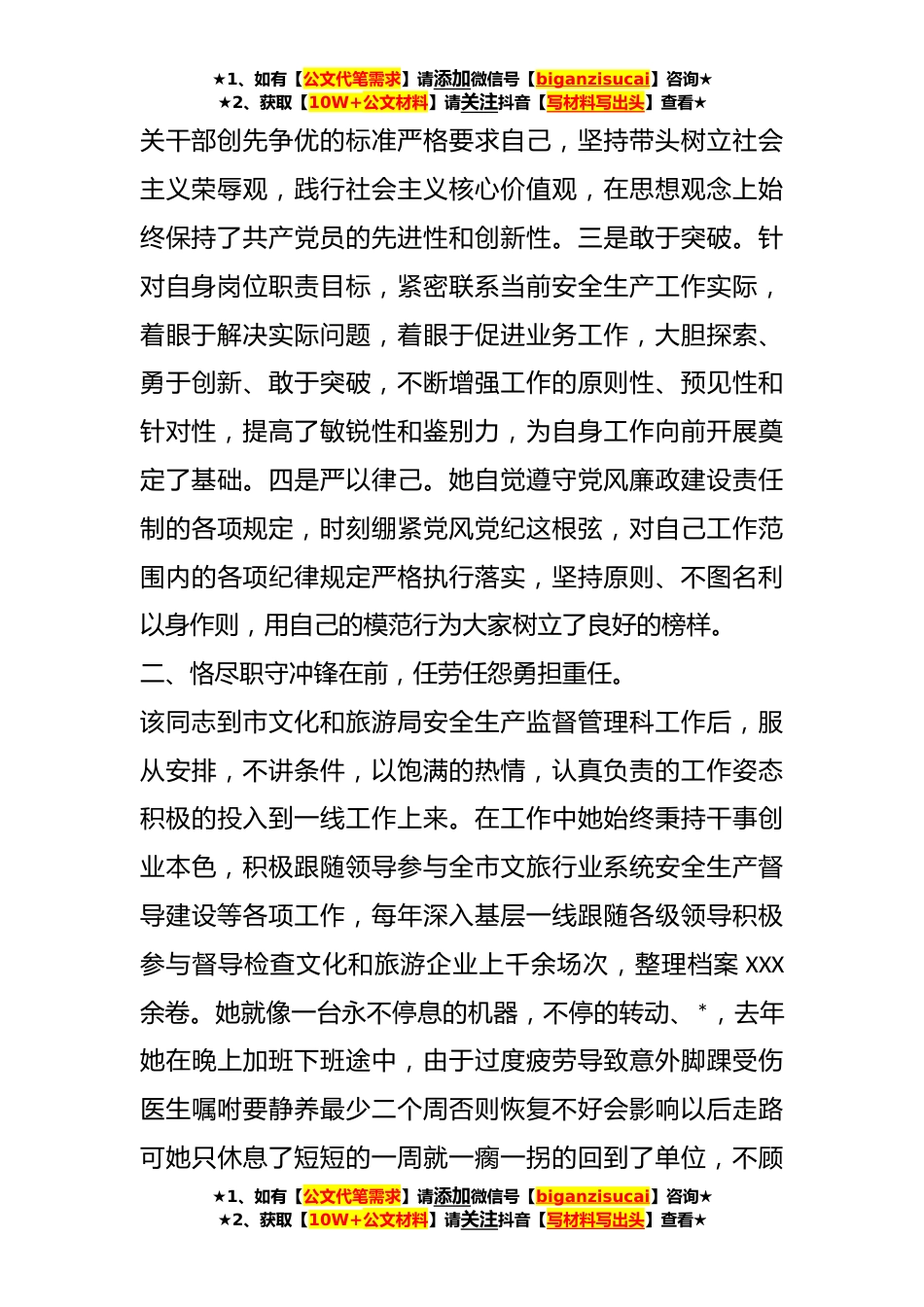 ★1、如有【公文代笔需求】请添加微信号【biganzisucai】咨询★★2、获取【10W+公文材料】请关注抖音【写材料写出头】查看★XX市文化和旅游局同志先进典型事迹材料XXX,女,XXX年XXX月出生,XXX人,XXX年XXX月参加工作,现任XXX市文化和旅游局安全生产监督管理科工作人员,该同志她始终牢固树立“认真只能将工作干对、用心才能将工作干好”的工作理念,能够模范的执行党的路线方针政策,遵守国家的法律法规法纪,工作期间考取了执法证,从事安全生产监督管理工作XXX年,工作中坚持原则,忠实履行安全监管职责,熟悉应急管理与安全生产法律法规、规程和标准,依法行政,认真组织开展安全检查发现问题及时整改落实,并且严格贯彻落实中央八项规定精神,清正廉洁,无违法违纪行为,工作业绩得到了基层群众和上级领导...