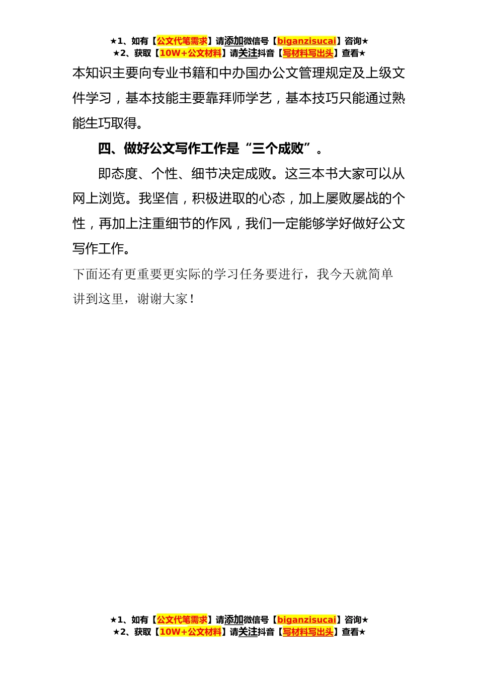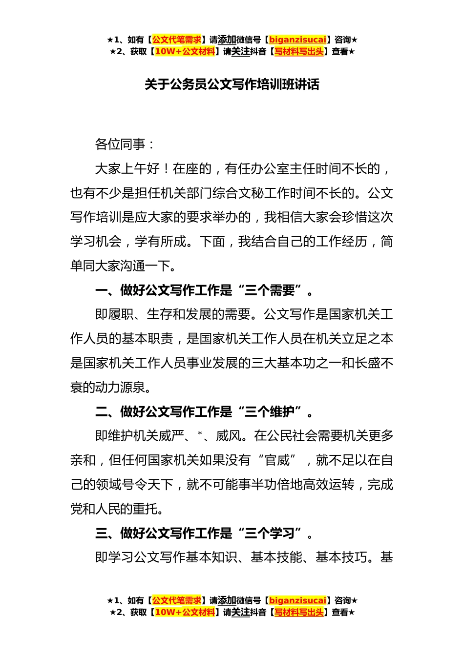 ★1、如有【公文代笔需求】请添加微信号【biganzisucai】咨询★★2、获取【10W+公文材料】请关注抖音【写材料写出头】查看★关于公务员公文写作培训班讲话各位同事:大家上午好!在座的,有任办公室主任时间不长的,也有不少是担任机关部门综合文秘工作时间不长的。公文写作培训是应大家的要求举办的,我相信大家会珍惜这次学习机会,学有所成。下面,我结合自己的工作经历,简单同大家沟通一下。一、做好公文写作工作是“三个需要”。即履职、生存和发展的需要。公文写作是国家机关工作人员的基本职责,是国家机关工作人员在机关立足之本是国家机关工作人员事业发展的三大基本功之一和长盛不衰的动力源泉。二、做好公文写作工作是“三个维护”。即维护机关威严、*、威风。在公民社会需要机关更多亲和,但任何国家...