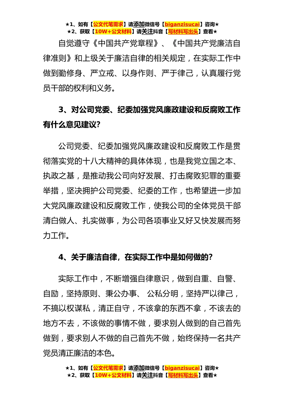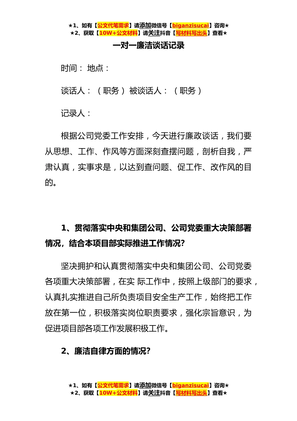 ★1、如有【公文代笔需求】请添加微信号【biganzisucai】咨询★★2、获取【10W+公文材料】请关注抖音【写材料写出头】查看★一对一廉洁谈话记录时间:地点:谈话人:(职务)被谈话人:(职务)记录人:根据公司党委工作安排,今天进行廉政谈话,我们要从思想、工作、作风等方面深刻查摆问题,剖析自我,严肃认真,实事求是,以达到查问题、促工作、改作风的目的。1、贯彻落实中央和集团公司、公司党委重大决策部署情况,结合本项目部实际推进工作情况?坚决拥护和认真贯彻落实中央和集团公司、公司党委各项重大决策部署,在实际工作中,按照上级部门的要求,认真扎实推进自己所负责项目安全生产工作,始终把工作放在第一位,积极落实岗位职责要求,强化宗旨意识,为促进项目部各项工作发展积极工作。2、廉洁自律...