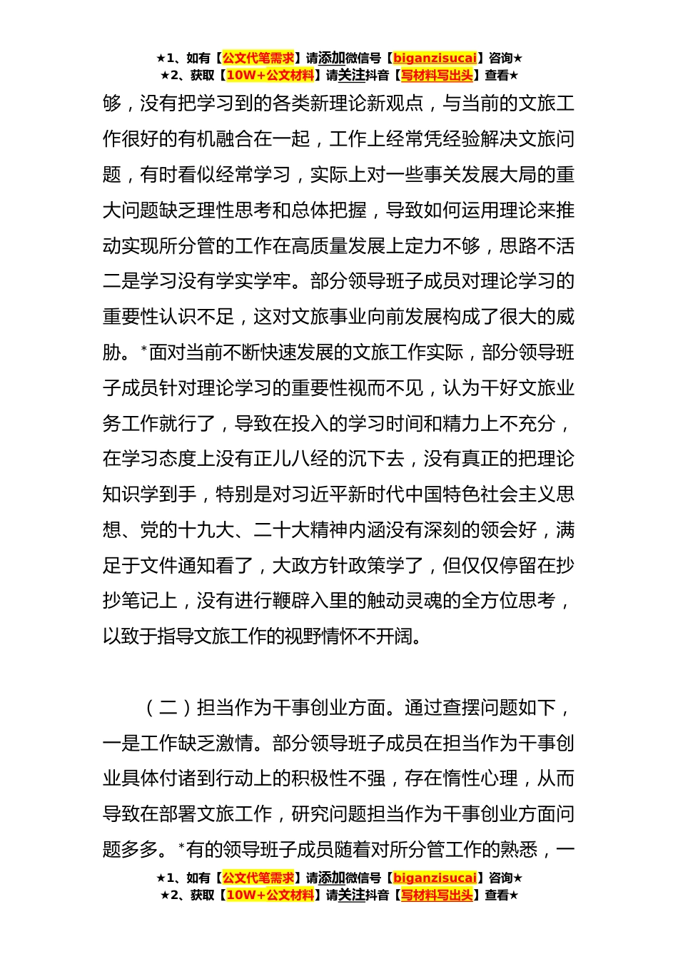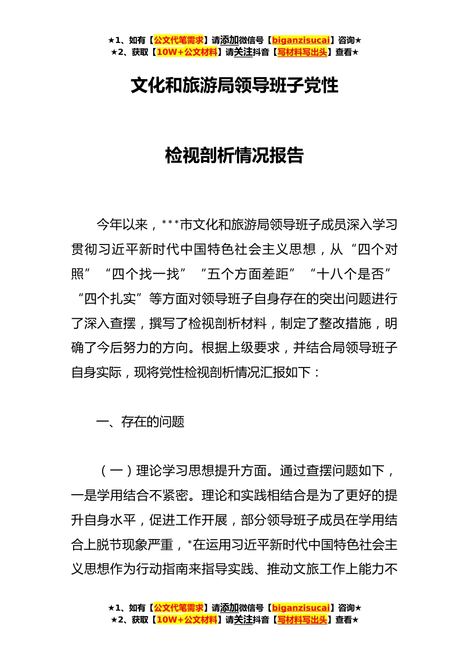 ★1、如有【公文代笔需求】请添加微信号【biganzisucai】咨询★★2、获取【10W+公文材料】请关注抖音【写材料写出头】查看★文化和旅游局领导班子党性检视剖析情况报告今年以来,***市文化和旅游局领导班子成员深入学习贯彻习近平新时代中国特色社会主义思想,从“四个对照”“四个找一找”“五个方面差距”“十八个是否”“四个扎实”等方面对领导班子自身存在的突出问题进行了深入查摆,撰写了检视剖析材料,制定了整改措施,明确了今后努力的方向。根据上级要求,并结合局领导班子自身实际,现将党性检视剖析情况汇报如下:一、存在的问题(一)理论学习思想提升方面。通过查摆问题如下,一是学用结合不紧密。理论和实践相结合是为了更好的提升自身水平,促进工作开展,部分领导班子成员在学用结合上脱节现象严...