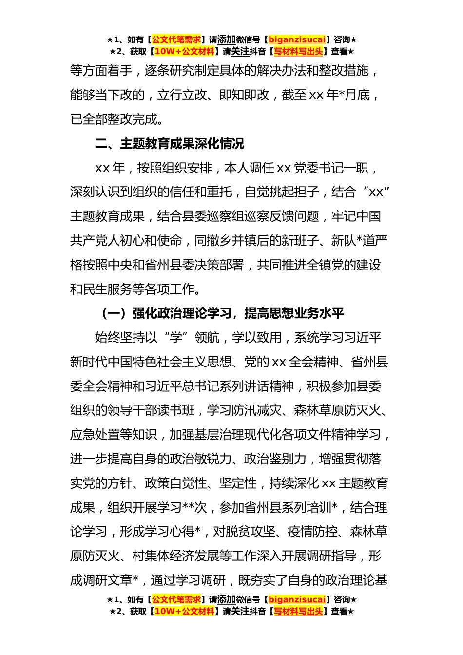 ★1、如有【公文代笔需求】请添加微信号【biganzisucai】咨询★★2、获取【10W+公文材料】请关注抖音【写材料写出头】查看★党员领导个人查摆问题整改情况报告自开展“xx”主题教育以来,本人始终坚持问题导向,正视问题,刀刃向内,将整改贯穿始终主题教育始终,而自己不论在xx还是xx任职,都将学习教育、调查研究、检视问题、整改落实作为自身工作水*执政能力提升的重要途径,主题教育成果不断深化和固化。一、问题检视和整改情况xx年从“*个是否”方面检视主要存在理论学习有差距,带动群众发展经济上有差距,从群众中来、到群众中去有差距,意识形态工作学以致用有差距,党要管党、从严治党落实有差距,存在一定的形式主义和官僚主义,家风家教有所松懈以及从上级党组织反出烟果矛盾日益凸显等问题。对于自身...