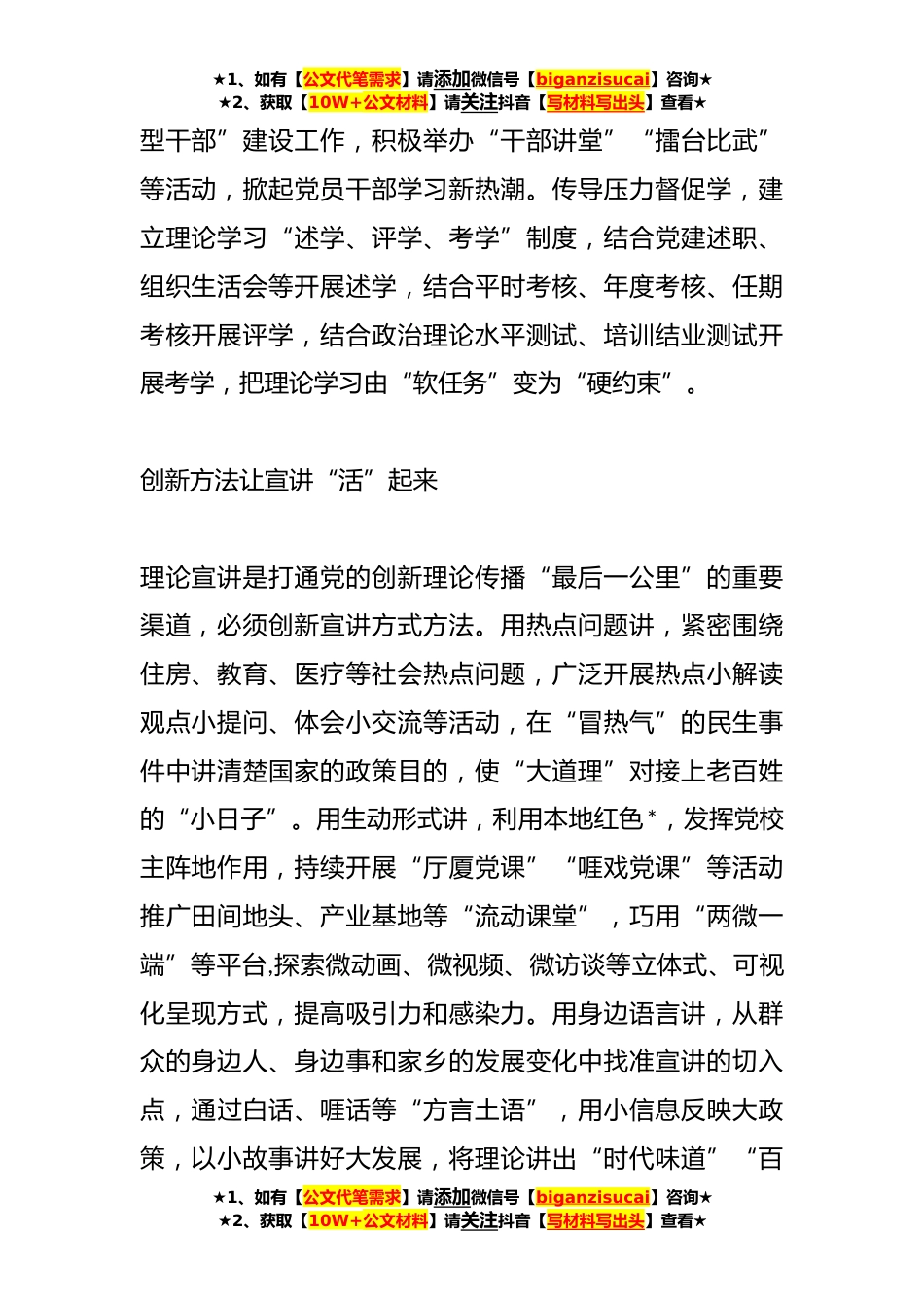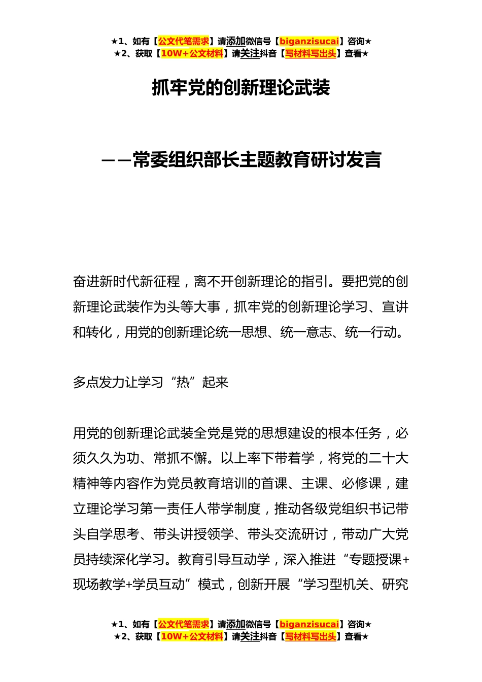 ★1、如有【公文代笔需求】请添加微信号【biganzisucai】咨询★★2、获取【10W+公文材料】请关注抖音【写材料写出头】查看★抓牢党的创新理论武装——常委组织部长主题教育研讨发言奋进新时代新征程,离不开创新理论的指引。要把党的创新理论武装作为头等大事,抓牢党的创新理论学习、宣讲和转化,用党的创新理论统一思想、统一意志、统一行动。多点发力让学习“热”起来用党的创新理论武装全党是党的思想建设的根本任务,必须久久为功、常抓不懈。以上率下带着学,将党的二十大精神等内容作为党员教育培训的首课、主课、必修课,建立理论学习第一责任人带学制度,推动各级党组织书记带头自学思考、带头讲授领学、带头交流研讨,带动广大党员持续深化学习。教育引导互动学,深入推进“专题授课+现场教学+学员互动...