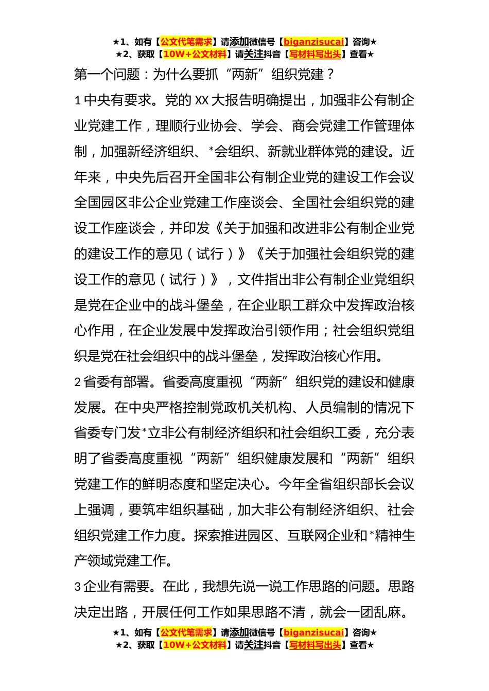 ★1、如有【公文代笔需求】请添加微信号【biganzisucai】咨询★★2、获取【10W+公文材料】请关注抖音【写材料写出头】查看★专题党课:全面加强“两新”组织党的建设习近平总书记就“两新”组织党建工作作出一系列重要指示批示。对于加强和改进非公有制经济组织党建工作,总书记强调,非公有制企业是发展社会主义市场经济的重要力量。非公有制企业的数量和作用决定了非公有制企业党建工作在整个党建工作中越来越重要,必须以更大的工作力度扎扎实实抓好。对于加强和改进社会组织党建工作,总书记指出,社会组织面大量广,加强社会组织党的建设十分重要;要进一步扩大组织覆盖和工作覆盖,理顺社会组织党建工作管理体制,积极探索党组织发挥作用的有效途径;要把加强行业党建与推进行业发展紧密结合,在阵地建设、...