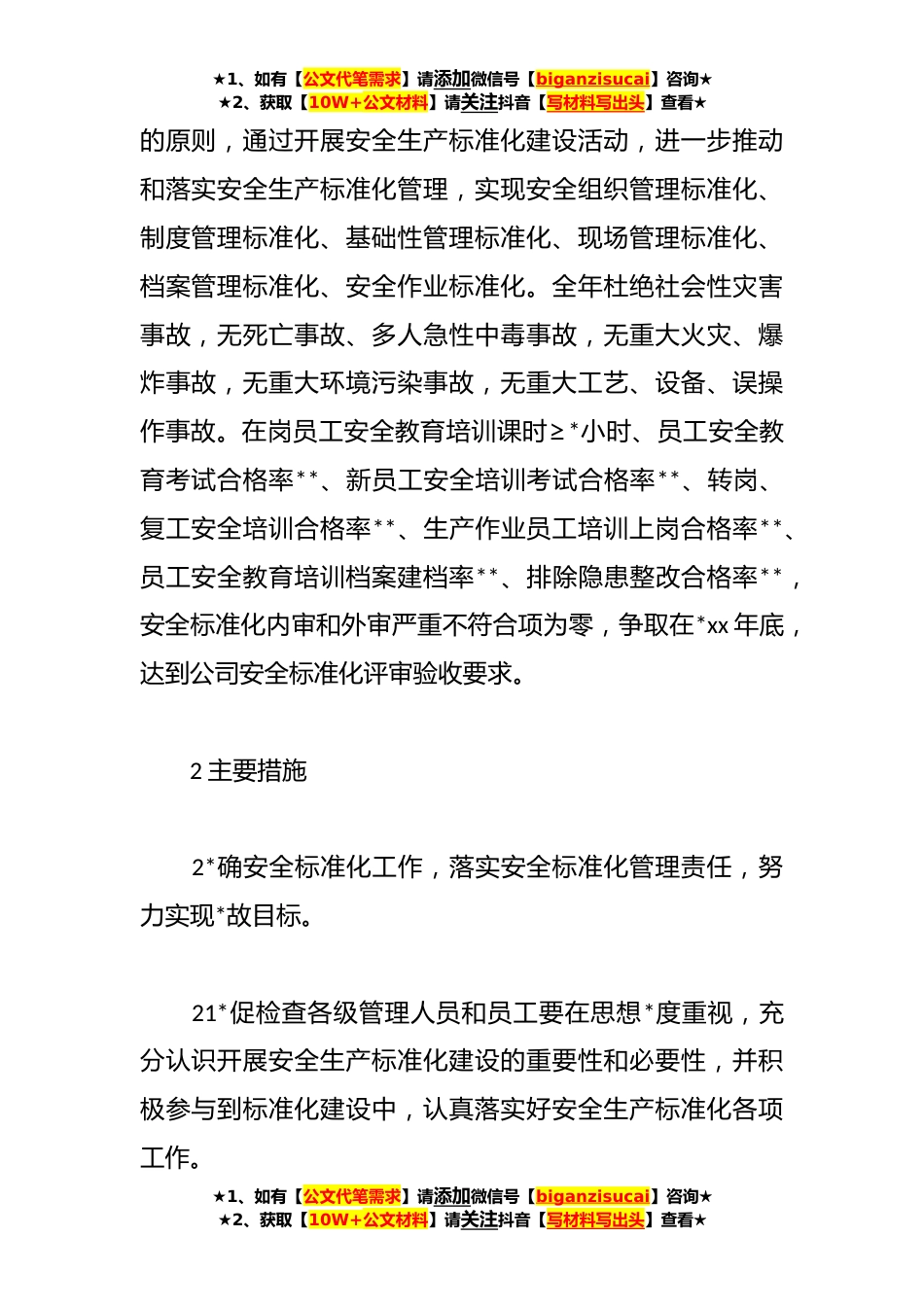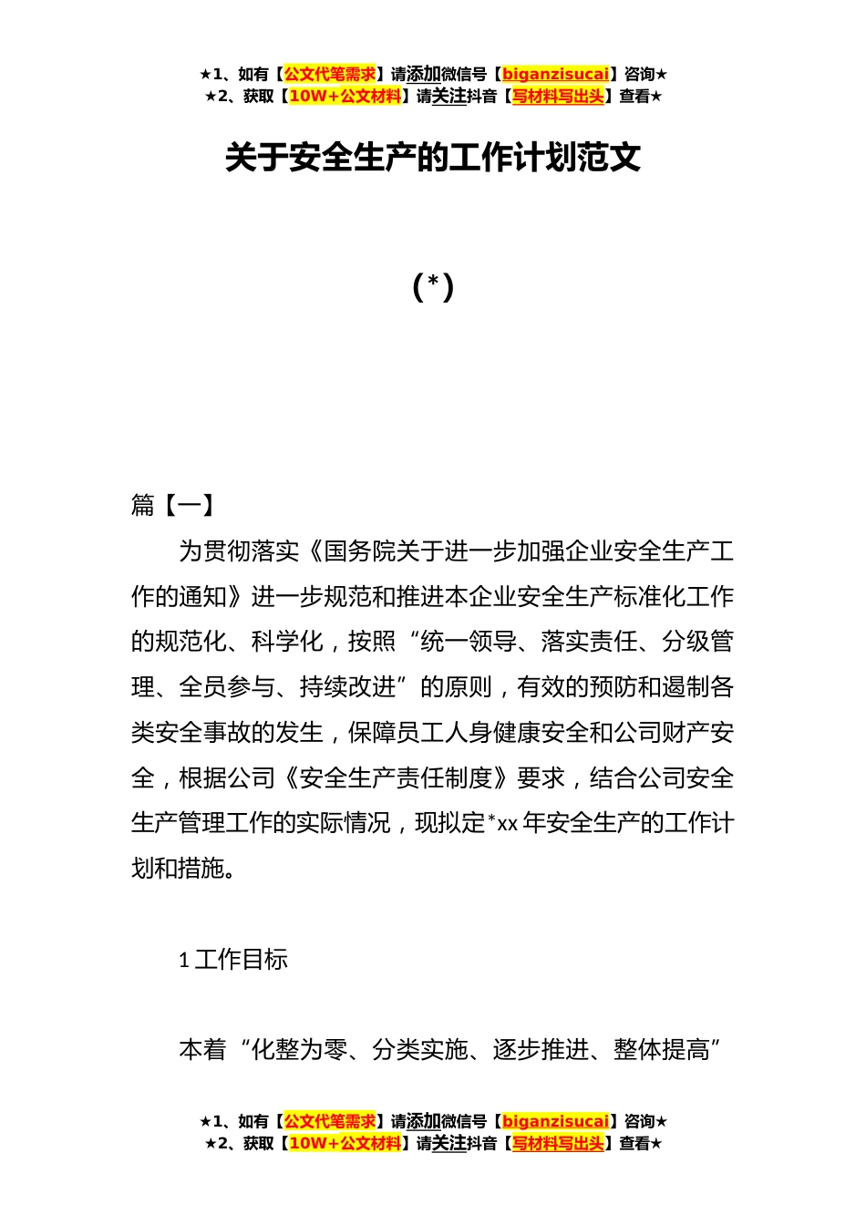 ★1、如有【公文代笔需求】请添加微信号【biganzisucai】咨询★★2、获取【10W+公文材料】请关注抖音【写材料写出头】查看★关于安全生产的工作计划范文(*)篇【一】为贯彻落实《国务院关于进一步加强企业安全生产工作的通知》进一步规范和推进本企业安全生产标准化工作的规范化、科学化,按照“统一领导、落实责任、分级管理、全员参与、持续改进”的原则,有效的预防和遏制各类安全事故的发生,保障员工人身健康安全和公司财产安全,根据公司《安全生产责任制度》要求,结合公司安全生产管理工作的实际情况,现拟定*xx年安全生产的工作计划和措施。1工作目标本着“化整为零、分类实施、逐步推进、整体提高”★1、如有【公文代笔需求】请添加微信号【biganzisucai】咨询★★2、获取【10W+公文材料】请关注抖音【...