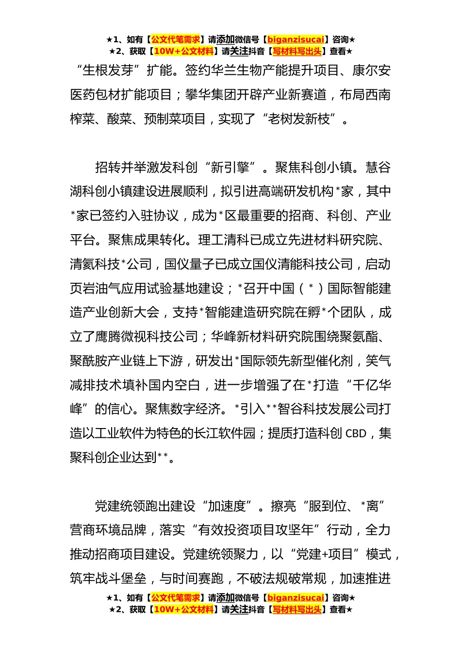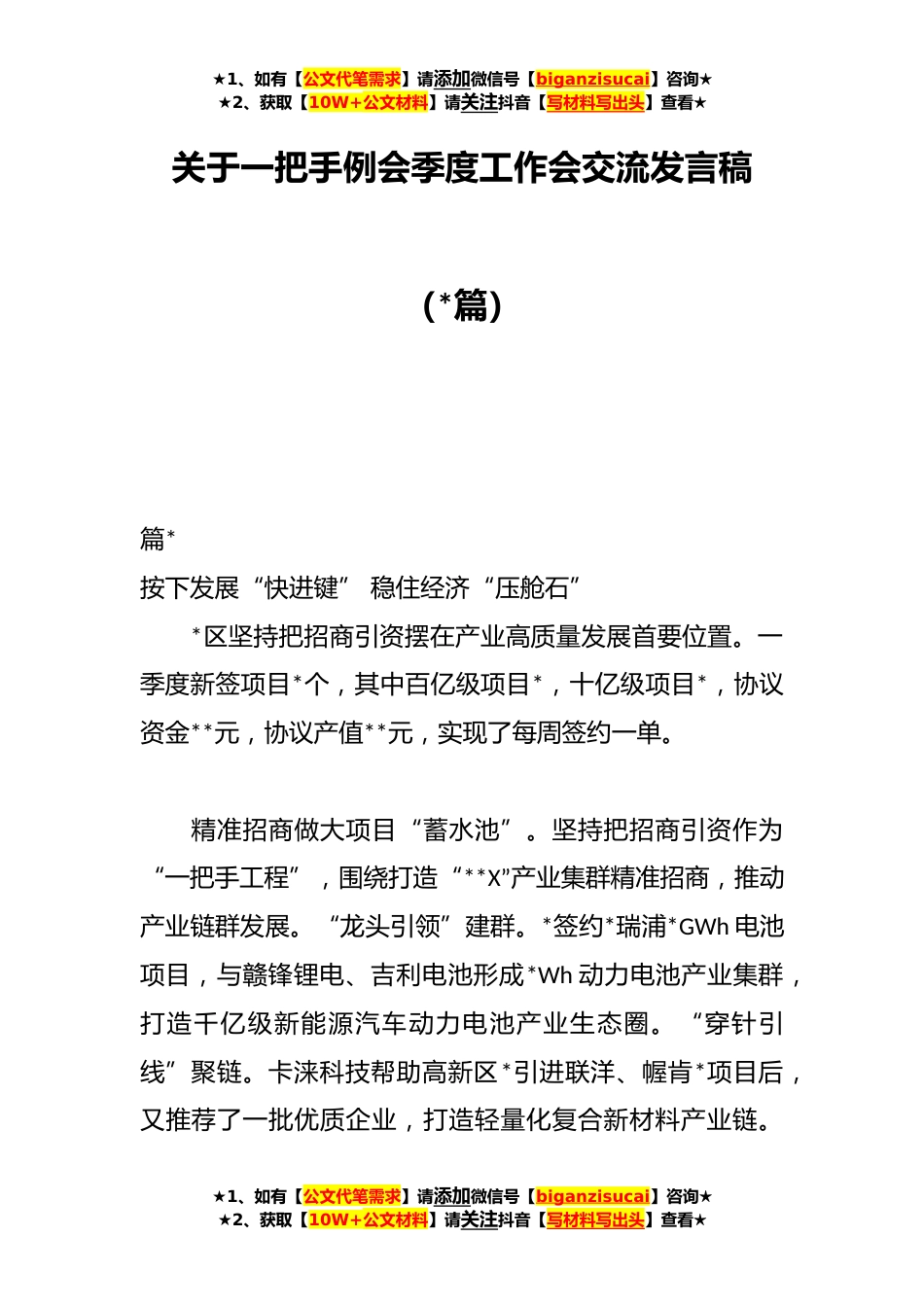★1、如有【公文代笔需求】请添加微信号【biganzisucai】咨询★★2、获取【10W+公文材料】请关注抖音【写材料写出头】查看★关于一把手例会季度工作会交流发言稿(*篇)篇*按下发展“快进键”稳住经济“压舱石”*区坚持把招商引资摆在产业高质量发展首要位置。一季度新签项目*个,其中百亿级项目*,十亿级项目*,协议资金**元,协议产值**元,实现了每周签约一单。精准招商做大项目“蓄水池”。坚持把招商引资作为“一把手工程”,围绕打造“**X”产业集群精准招商,推动产业链群发展。“龙头引领”建群。*签约*瑞浦*GWh电池项目,与赣锋锂电、吉利电池形成*Wh动力电池产业集群,打造千亿级新能源汽车动力电池产业生态圈。“穿针引线”聚链。卡涞科技帮助高新区*引进联洋、幄肯*项目后,又推荐了一批优质企业,打...