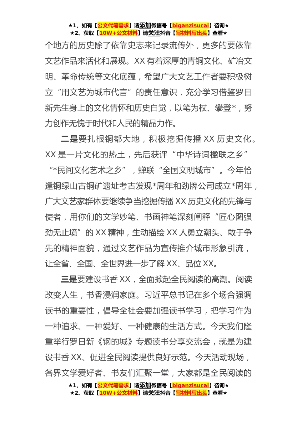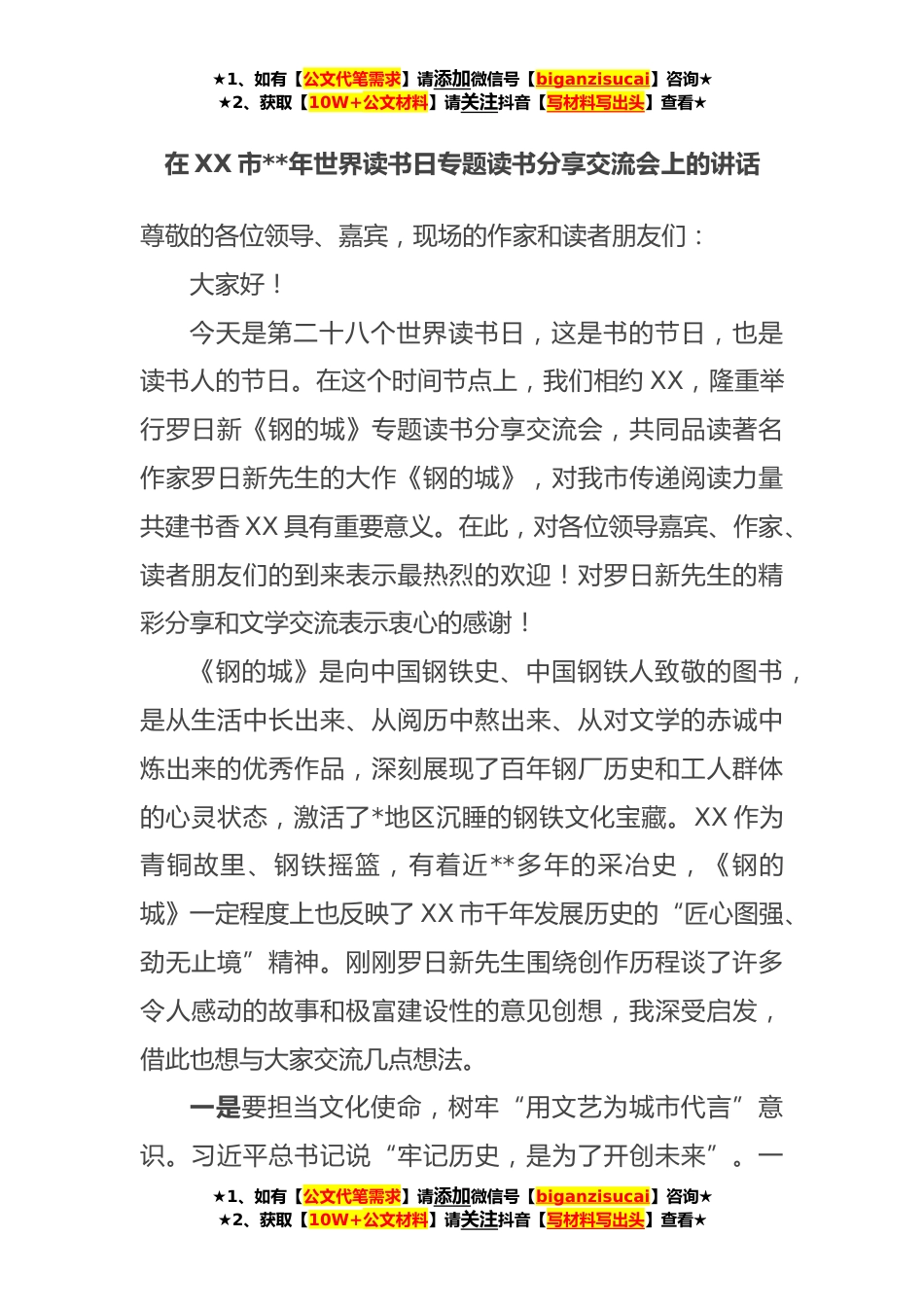 ★1、如有【公文代笔需求】请添加微信号【biganzisucai】咨询★★2、获取【10W+公文材料】请关注抖音【写材料写出头】查看★在XX市**年世界读书日专题读书分享交流会上的讲话尊敬的各位领导、嘉宾,现场的作家和读者朋友们:大家好!今天是第二十八个世界读书日,这是书的节日,也是读书人的节日。在这个时间节点上,我们相约XX,隆重举行罗日新《钢的城》专题读书分享交流会,共同品读著名作家罗日新先生的大作《钢的城》,对我市传递阅读力量共建书香XX具有重要意义。在此,对各位领导嘉宾、作家、读者朋友们的到来表示最热烈的欢迎!对罗日新先生的精彩分享和文学交流表示衷心的感谢!《钢的城》是向中国钢铁史、中国钢铁人致敬的图书,是从生活中长出来、从阅历中熬出来、从对文学的赤诚中炼出来的优秀作品,...
