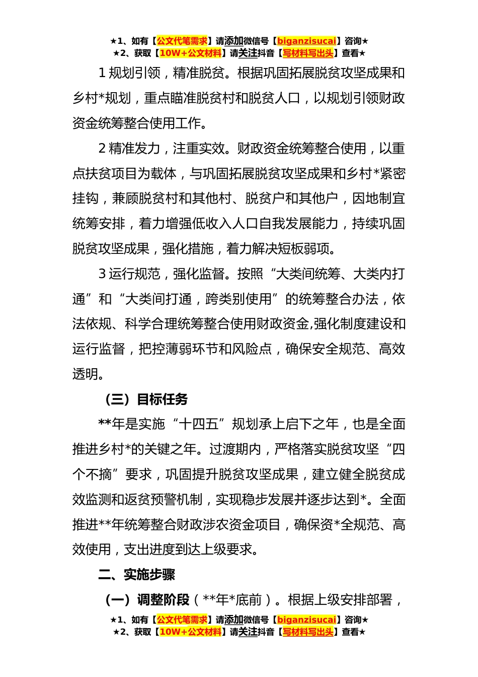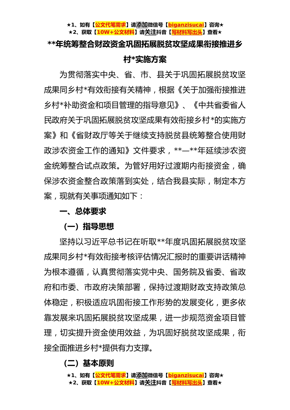 ★1、如有【公文代笔需求】请添加微信号【biganzisucai】咨询★★2、获取【10W+公文材料】请关注抖音【写材料写出头】查看★**年统筹整合财政资金巩固拓展脱贫攻坚成果衔接推进乡村*实施方案为贯彻落实中央、省、市、县关于巩固拓展脱贫攻坚成果同乡村*有效衔接有关精神,根据《关于加强衔接推进乡村*补助资金和项目管理的指导意见》、《中共省委省人民政府关于巩固拓展脱贫攻坚成果有效衔接乡村*的实施方案》和《省财政厅等关于继续支持脱贫县统筹整合使用财政涉农资金工作的通知》文件要求,**—**年延续涉农资金统筹整合试点政策。为管好用好过渡期内衔接资金,确保涉农资金整合政策落到实处,结合我县实际,制定本方案,现就有关事项通知如下:一、总体要求(一)指导思想坚持以习近平总书记在听取**年度巩固...