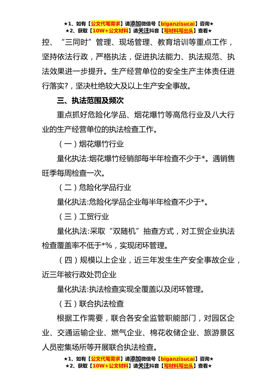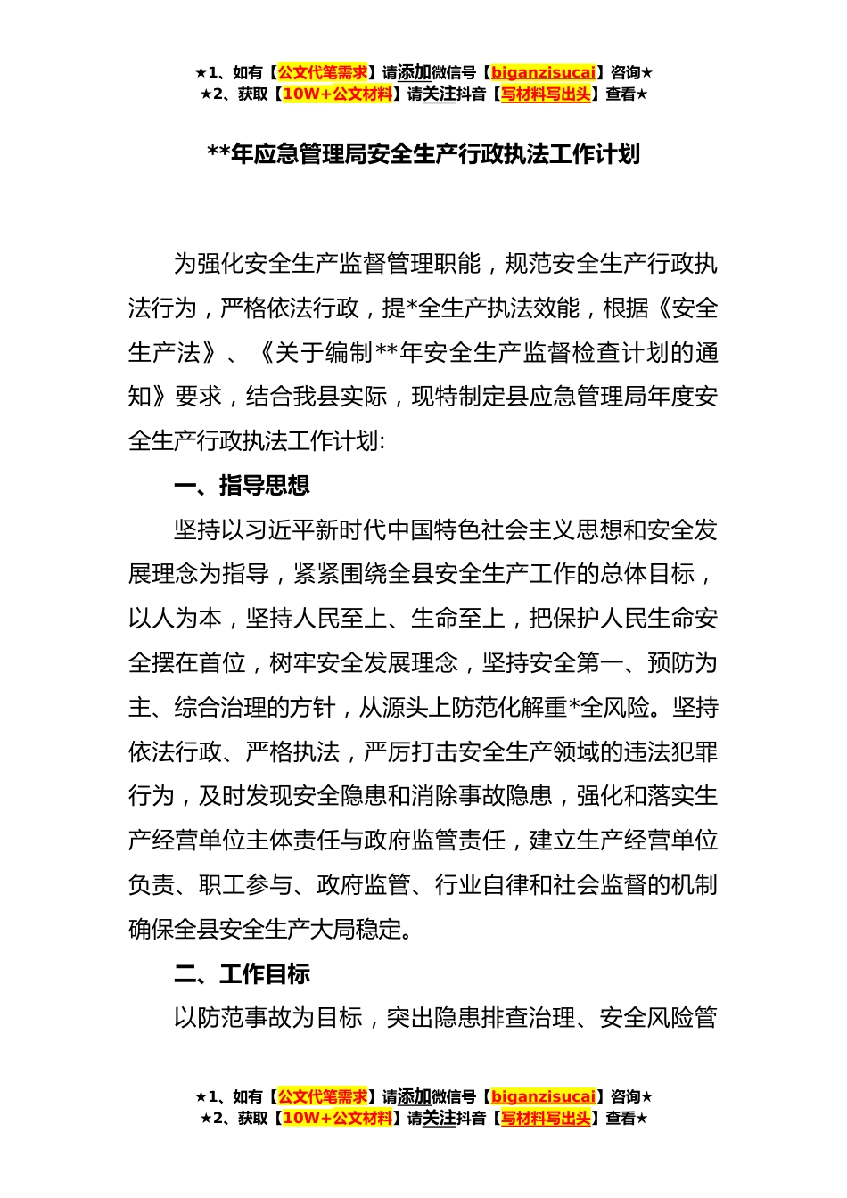 ★1、如有【公文代笔需求】请添加微信号【biganzisucai】咨询★★2、获取【10W+公文材料】请关注抖音【写材料写出头】查看★**年应急管理局安全生产行政执法工作计划为强化安全生产监督管理职能,规范安全生产行政执法行为,严格依法行政,提*全生产执法效能,根据《安全生产法》、《关于编制**年安全生产监督检查计划的通知》要求,结合我县实际,现特制定县应急管理局年度安全生产行政执法工作计划:一、指导思想坚持以习近平新时代中国特色社会主义思想和安全发展理念为指导,紧紧围绕全县安全生产工作的总体目标,以人为本,坚持人民至上、生命至上,把保护人民生命安全摆在首位,树牢安全发展理念,坚持安全第一、预防为主、综合治理的方针,从源头上防范化解重*全风险。坚持依法行政、严格执法,严厉打击安全...