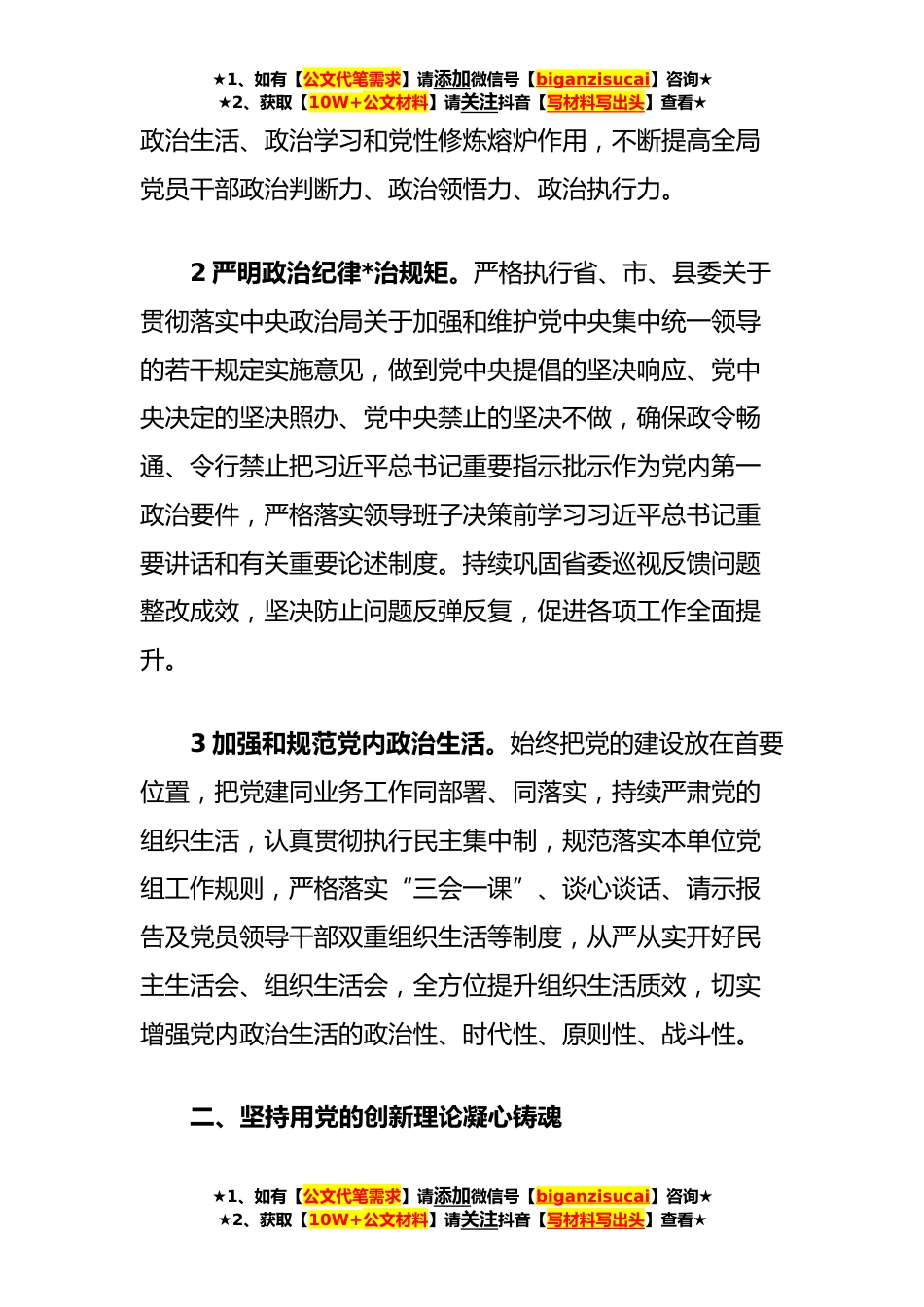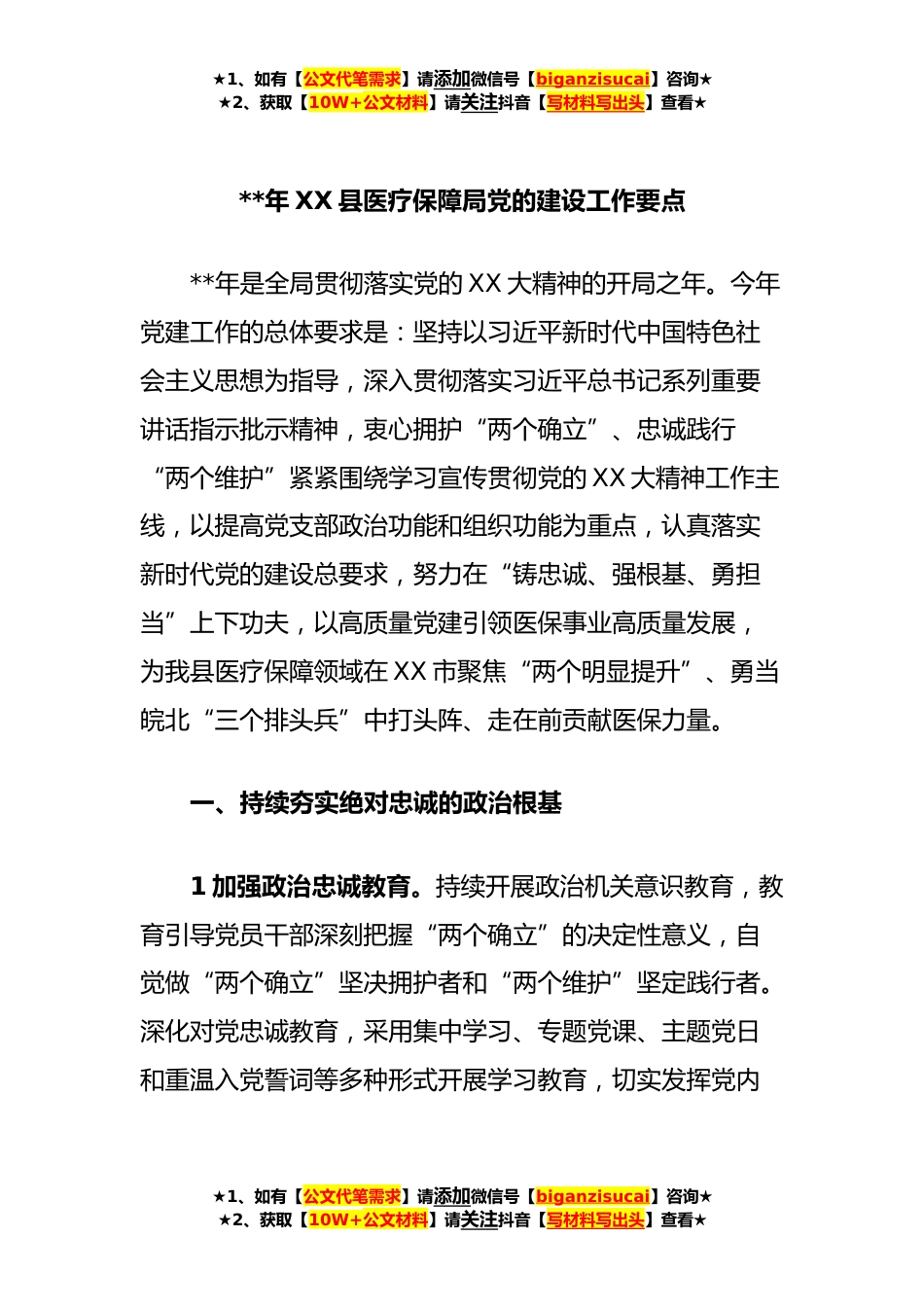 ★1、如有【公文代笔需求】请添加微信号【biganzisucai】咨询★★2、获取【10W+公文材料】请关注抖音【写材料写出头】查看★**年XX县医疗保障局党的建设工作要点**年是全局贯彻落实党的XX大精神的开局之年。今年党建工作的总体要求是:坚持以习近平新时代中国特色社会主义思想为指导,深入贯彻落实习近平总书记系列重要讲话指示批示精神,衷心拥护“两个确立”、忠诚践行“两个维护”紧紧围绕学习宣传贯彻党的XX大精神工作主线,以提高党支部政治功能和组织功能为重点,认真落实新时代党的建设总要求,努力在“铸忠诚、强根基、勇担当”上下功夫,以高质量党建引领医保事业高质量发展,为我县医疗保障领域在XX市聚焦“两个明显提升”、勇当皖北“三个排头兵”中打头阵、走在前贡献医保力量。一、持续夯实绝对忠诚...