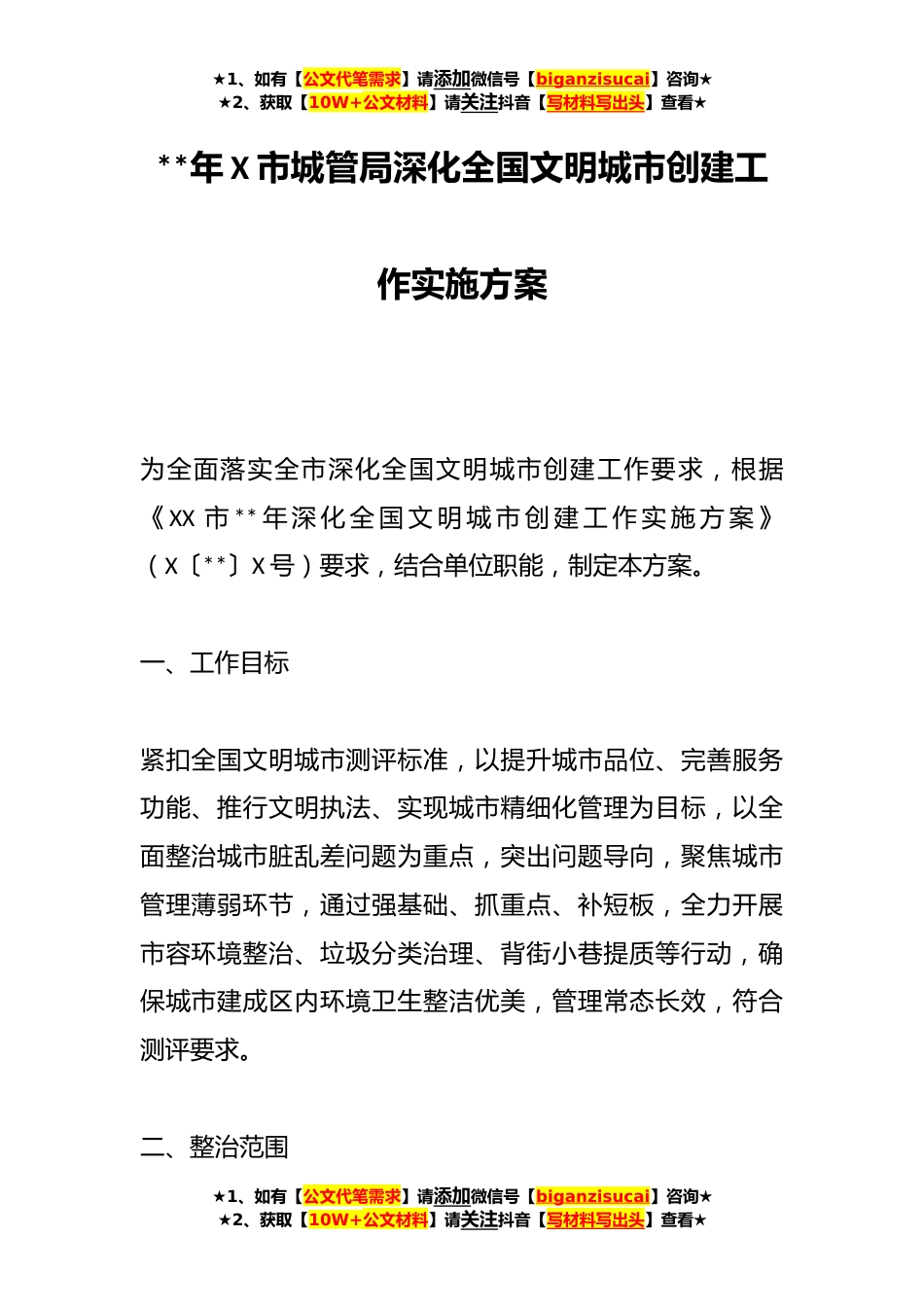 ★1、如有【公文代笔需求】请添加微信号【biganzisucai】咨询★★2、获取【10W+公文材料】请关注抖音【写材料写出头】查看★**年X市城管局深化全国文明城市创建工作实施方案为全面落实全市深化全国文明城市创建工作要求,根据《XX市**年深化全国文明城市创建工作实施方案》(X〔**〕X号)要求,结合单位职能,制定本方案。一、工作目标紧扣全国文明城市测评标准,以提升城市品位、完善服务功能、推行文明执法、实现城市精细化管理为目标,以全面整治城市脏乱差问题为重点,突出问题导向,聚焦城市管理薄弱环节,通过强基础、抓重点、补短板,全力开展市容环境整治、垃圾分类治理、背街小巷提质等行动,确保城市建成区内环境卫生整洁优美,管理常态长效,符合测评要求。二、整治范围★1、如有【公文代笔需求】请添...