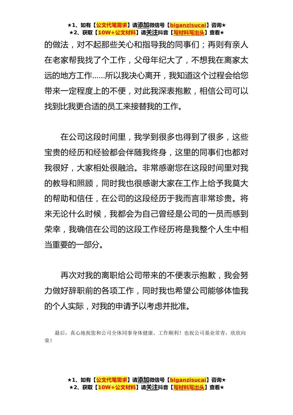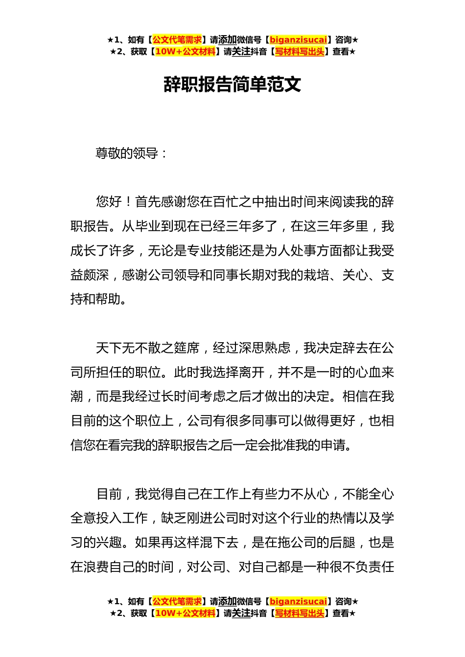★1、如有【公文代笔需求】请添加微信号【biganzisucai】咨询★★2、获取【10W+公文材料】请关注抖音【写材料写出头】查看★辞职报告简单范文尊敬的领导:您好!首先感谢您在百忙之中抽出时间来阅读我的辞职报告。从毕业到现在已经三年多了,在这三年多里,我成长了许多,无论是专业技能还是为人处事方面都让我受益颇深,感谢公司领导和同事长期对我的栽培、关心、支持和帮助。天下无不散之筵席,经过深思熟虑,我决定辞去在公司所担任的职位。此时我选择离开,并不是一时的心血来潮,而是我经过长时间考虑之后才做出的决定。相信在我目前的这个职位上,公司有很多同事可以做得更好,也相信您在看完我的辞职报告之后一定会批准我的申请。目前,我觉得自己在工作上有些力不从心,不能全心全意投入工作,缺乏刚进公...