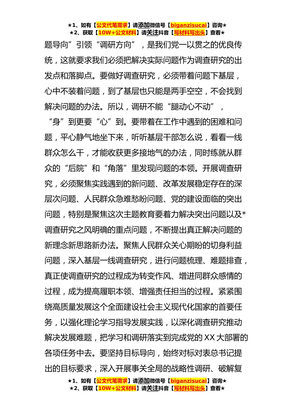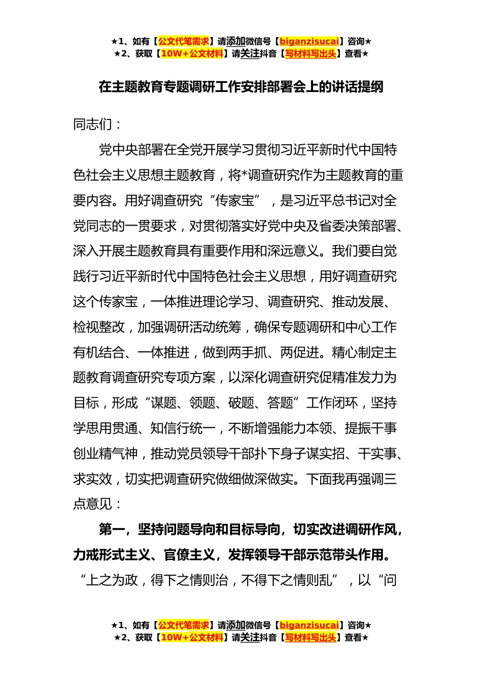★1、如有【公文代笔需求】请添加微信号【biganzisucai】咨询★★2、获取【10W+公文材料】请关注抖音【写材料写出头】查看★在主题教育专题调研工作安排部署会上的讲话提纲同志们:党中央部署在全党开展学习贯彻习近平新时代中国特色社会主义思想主题教育,将*调查研究作为主题教育的重要内容。用好调查研究“传家宝”,是习近平总书记对全党同志的一贯要求,对贯彻落实好党中央及省委决策部署、深入开展主题教育具有重要作用和深远意义。我们要自觉践行习近平新时代中国特色社会主义思想,用好调查研究这个传家宝,一体推进理论学习、调查研究、推动发展、检视整改,加强调研活动统筹,确保专题调研和中心工作有机结合、一体推进,做到两手抓、两促进。精心制定主题教育调查研究专项方案,以深化调查研究促精准发...