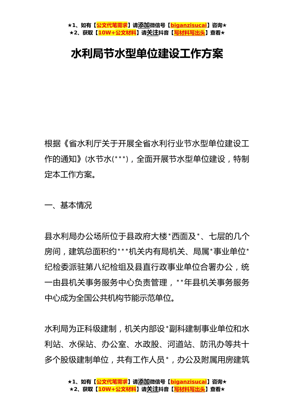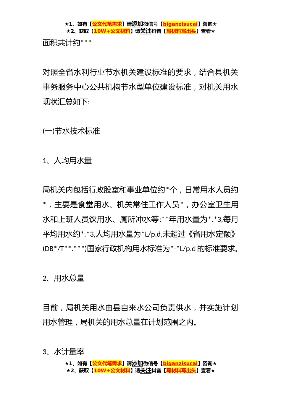 ★1、如有【公文代笔需求】请添加微信号【biganzisucai】咨询★★2、获取【10W+公文材料】请关注抖音【写材料写出头】查看★水利局节水型单位建设工作方案根据《省水利厅关于开展全省水利行业节水型单位建设工作的通知》(水节水(***),全面开展节水型单位建设,特制定本工作方案。一、基本情况县水利局办公场所位于县政府大楼*西面及*、七层的几个房间,建筑总面积约***机关内有局机关、局属*事业单位*纪检委派驻第八纪检组及县直行政事业单位合署办公,统一由县机关事务服务中心负责管理,**年县机关事务服务中心成为全国公共机构节能示范单位。水利局为正科级建制,机关内部设*副科建制事业单位和水利站、水保站、办公室、水政股、河道站、防汛办等共十多个股级建制单位,共有工作人员*,办公及附属用房建筑★1...