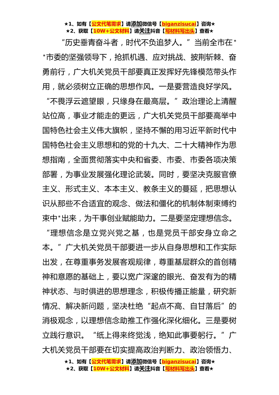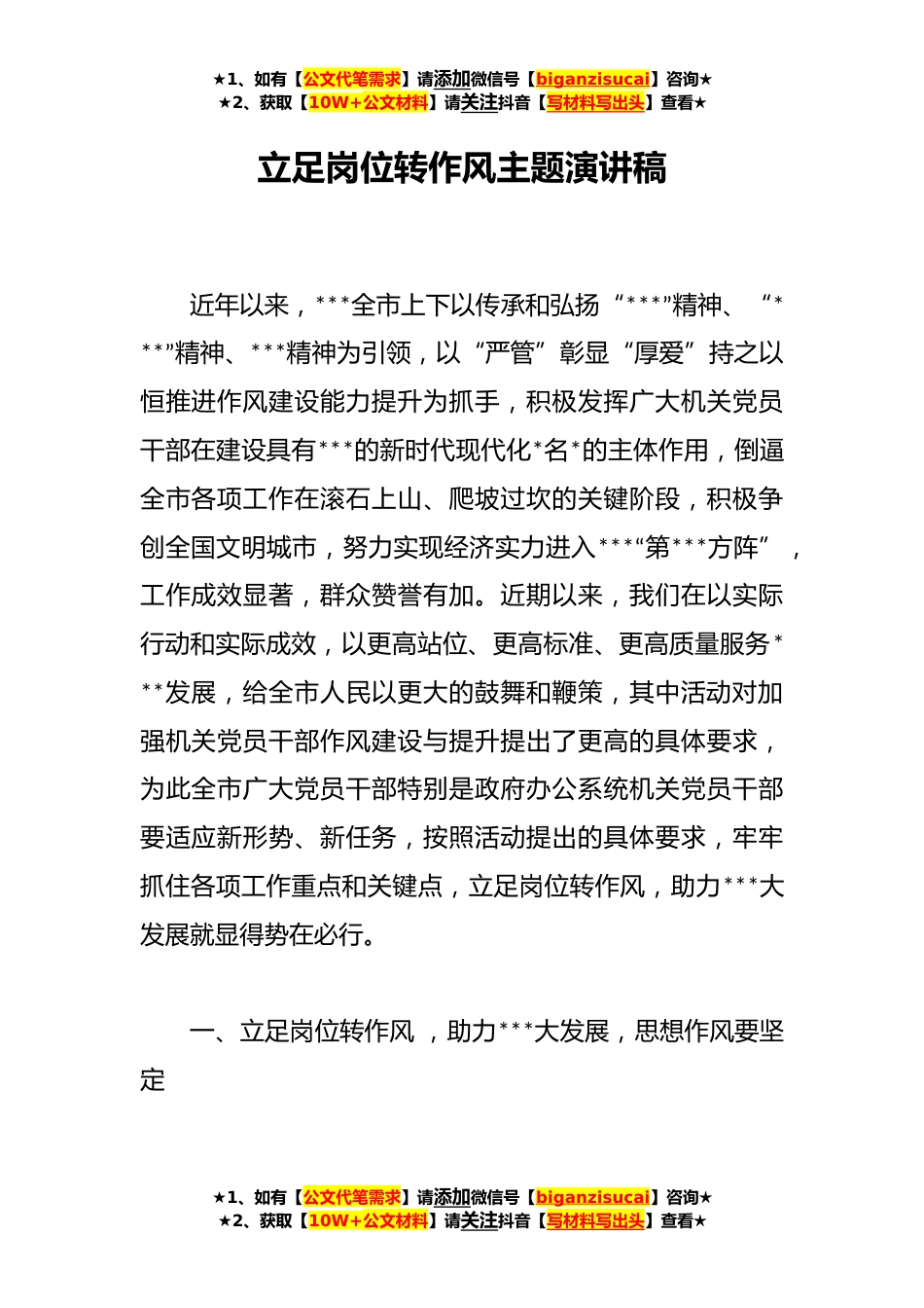 ★1、如有【公文代笔需求】请添加微信号【biganzisucai】咨询★★2、获取【10W+公文材料】请关注抖音【写材料写出头】查看★立足岗位转作风主题演讲稿近年以来,***全市上下以传承和弘扬“***”精神、“***”精神、***精神为引领,以“严管”彰显“厚爱”持之以恒推进作风建设能力提升为抓手,积极发挥广大机关党员干部在建设具有***的新时代现代化*名*的主体作用,倒逼全市各项工作在滚石上山、爬坡过坎的关键阶段,积极争创全国文明城市,努力实现经济实力进入***“第***方阵”,工作成效显著,群众赞誉有加。近期以来,我们在以实际行动和实际成效,以更高站位、更高标准、更高质量服务***发展,给全市人民以更大的鼓舞和鞭策,其中活动对加强机关党员干部作风建设与提升提出了更高的具体要求,为此全市广大党...