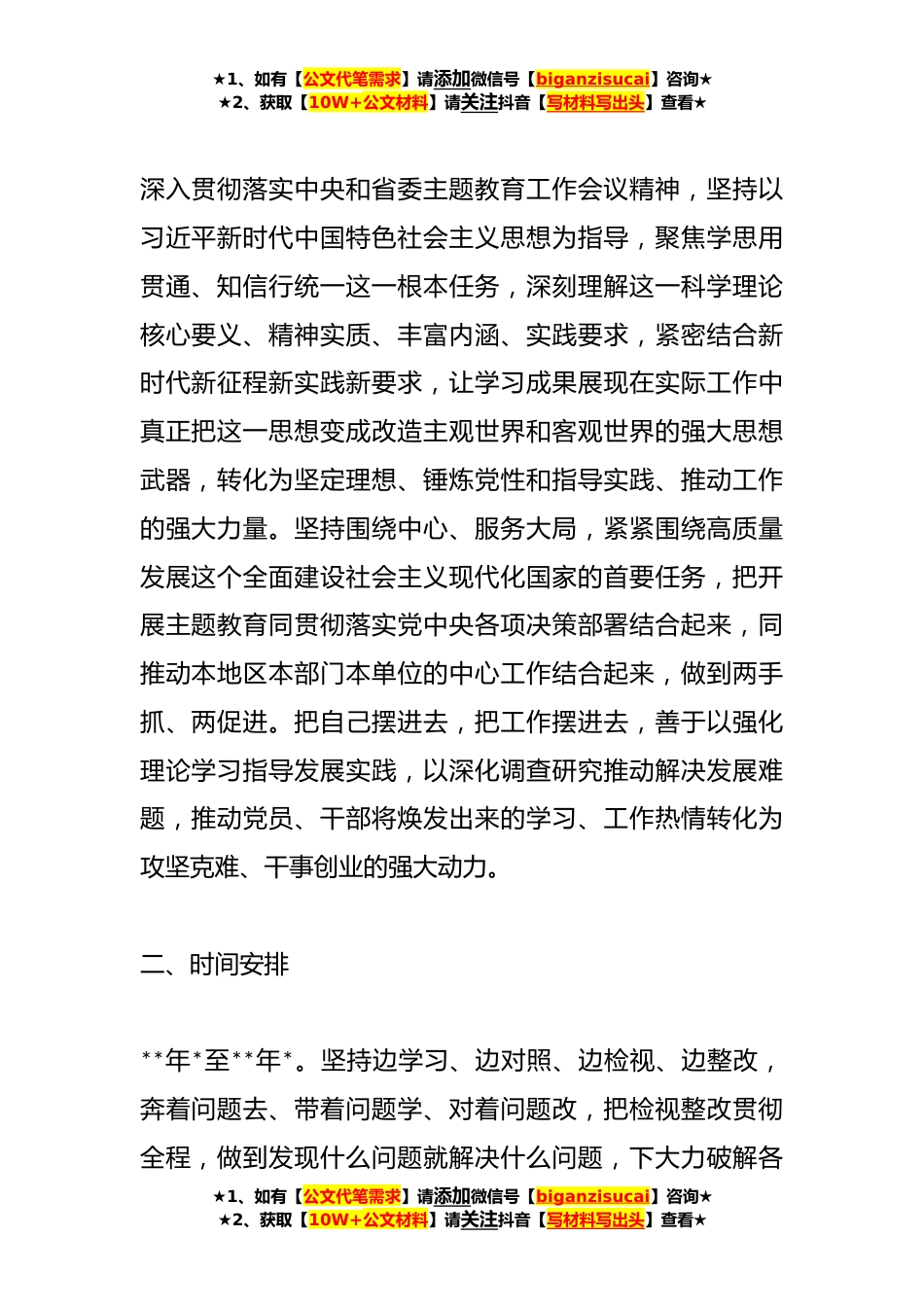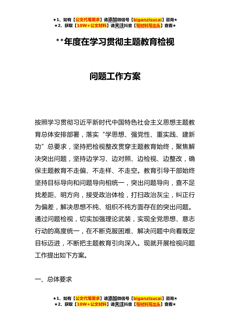 ★1、如有【公文代笔需求】请添加微信号【biganzisucai】咨询★★2、获取【10W+公文材料】请关注抖音【写材料写出头】查看★**年度在学习贯彻主题教育检视问题工作方案按照学习贯彻习近平新时代中国特色社会主义思想主题教育总体安排部署,落实“学思想、强党性、重实践、建新功”总要求,坚持把检视整改贯穿主题教育始终,聚焦解决突出问题,坚持边学习、边对照、边检视、边整改,确保主题教育不走偏、不走样、不走空。教育引导干部始终坚持目标导向和问题导向相统一,突出问题导向,查不足找差距、明方向,接受政治体检,打扫政治灰尘,纠正行为偏差,解决思想不纯、组织不纯方面存在的突出问题。通过问题检视,切实加强理论武装,实现全党思想、意志行动的高度统一,在不断克服困难、解决问题中向着既定目标迈...