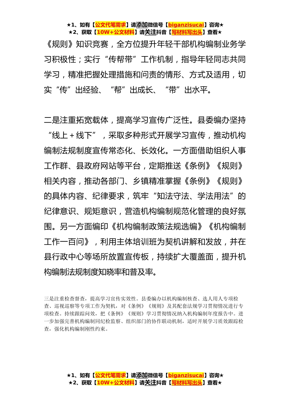 ★1、如有【公文代笔需求】请添加微信号【biganzisucai】咨询★★2、获取【10W+公文材料】请关注抖音【写材料写出头】查看★三注重三提高不断加强机构编制法规制度学习宣传XX县委编办多渠道创新开展机构编制法规制度学习宣传,着力推进机构编制法规制度走入机关、深入人心,为深入贯彻落实党的XX大精神,推进机构编制法治化建设提供坚强保障。一是注重示范引领,提高学习宣传精准性。县委编办将学习贯彻《中国共产党机构编制工作条例》(以下简称《条例》)《机构编制违规违纪违法行为处理和问责规则(试行)》(以下简称《规则》)作为日常学习任务,纳入县委编办月度办公会议重点学习内容,领导干部带头学,以“关键少数”带动“绝大多数”。以年轻干部为重点人群开展相关法规制度培训,通过集体学习、个人自学...