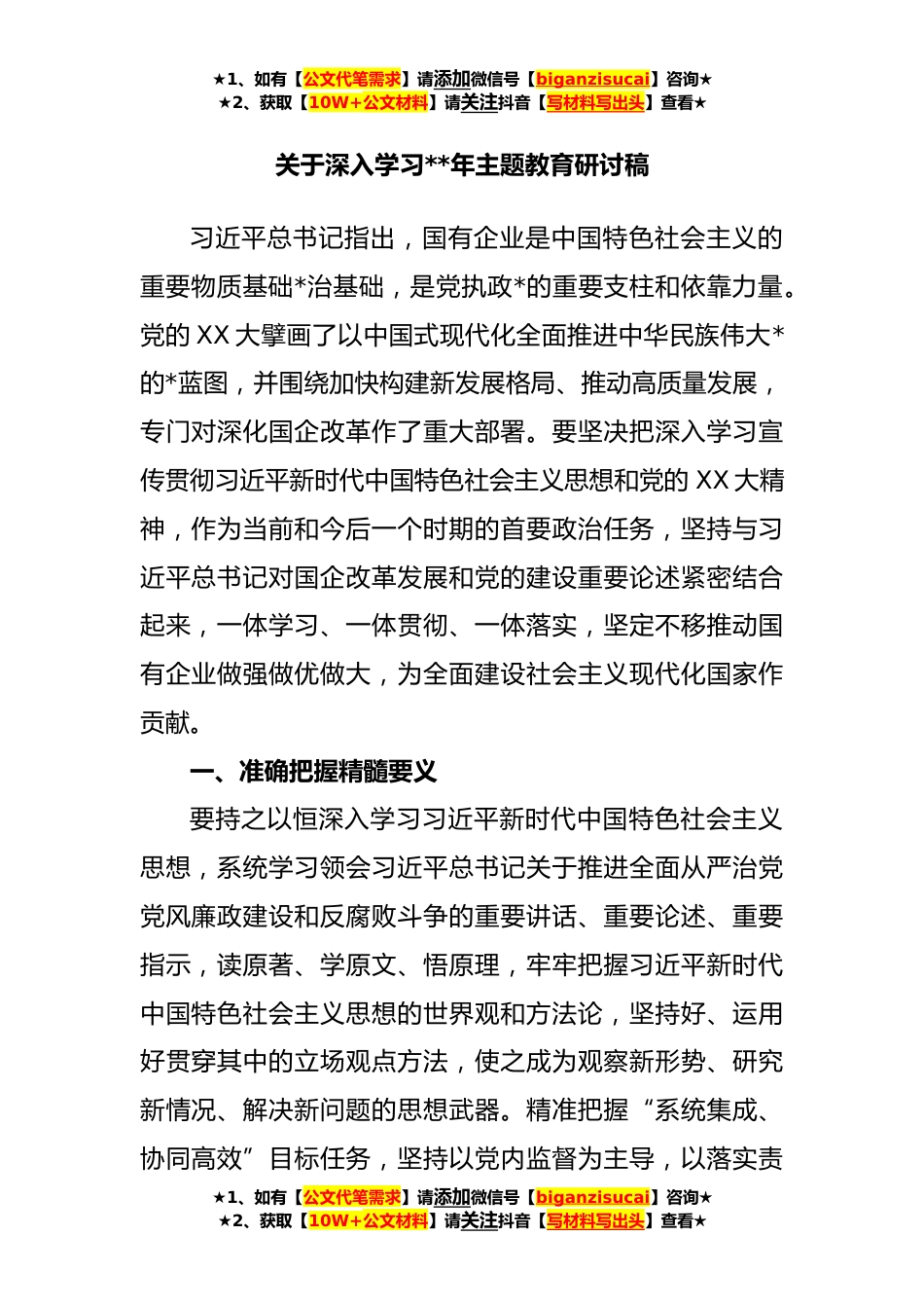 ★1、如有【公文代笔需求】请添加微信号【biganzisucai】咨询★★2、获取【10W+公文材料】请关注抖音【写材料写出头】查看★关于深入学习**年主题教育研讨稿习近平总书记指出,国有企业是中国特色社会主义的重要物质基础*治基础,是党执政*的重要支柱和依靠力量。党的XX大擘画了以中国式现代化全面推进中华民族伟大*的*蓝图,并围绕加快构建新发展格局、推动高质量发展,专门对深化国企改革作了重大部署。要坚决把深入学习宣传贯彻习近平新时代中国特色社会主义思想和党的XX大精神,作为当前和今后一个时期的首要政治任务,坚持与习近平总书记对国企改革发展和党的建设重要论述紧密结合起来,一体学习、一体贯彻、一体落实,坚定不移推动国有企业做强做优做大,为全面建设社会主义现代化国家作贡献。一、准确把握...