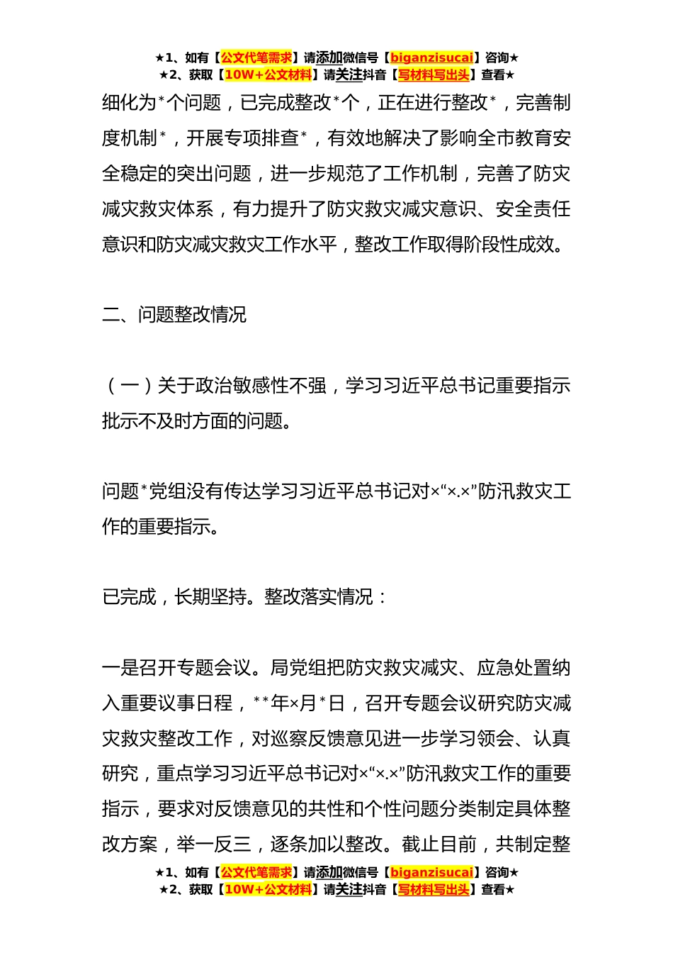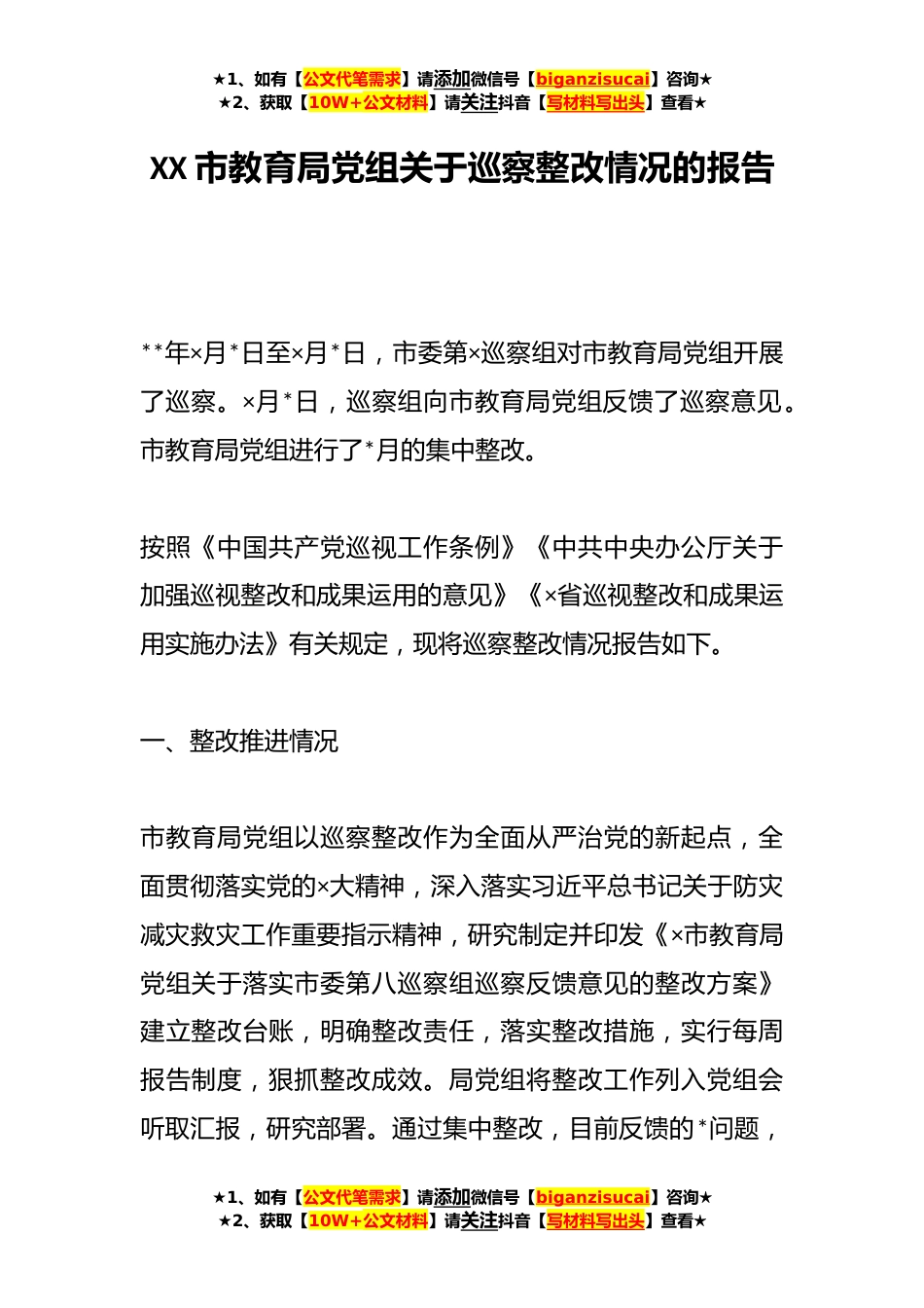 ★1、如有【公文代笔需求】请添加微信号【biganzisucai】咨询★★2、获取【10W+公文材料】请关注抖音【写材料写出头】查看★XX市教育局党组关于巡察整改情况的报告**年×月*日至×月*日,市委第×巡察组对市教育局党组开展了巡察。×月*日,巡察组向市教育局党组反馈了巡察意见。市教育局党组进行了*月的集中整改。按照《中国共产党巡视工作条例》《中共中央办公厅关于加强巡视整改和成果运用的意见》《×省巡视整改和成果运用实施办法》有关规定,现将巡察整改情况报告如下。一、整改推进情况市教育局党组以巡察整改作为全面从严治党的新起点,全面贯彻落实党的×大精神,深入落实习近平总书记关于防灾减灾救灾工作重要指示精神,研究制定并印发《×市教育局党组关于落实市委第八巡察组巡察反馈意见的整改方案》...