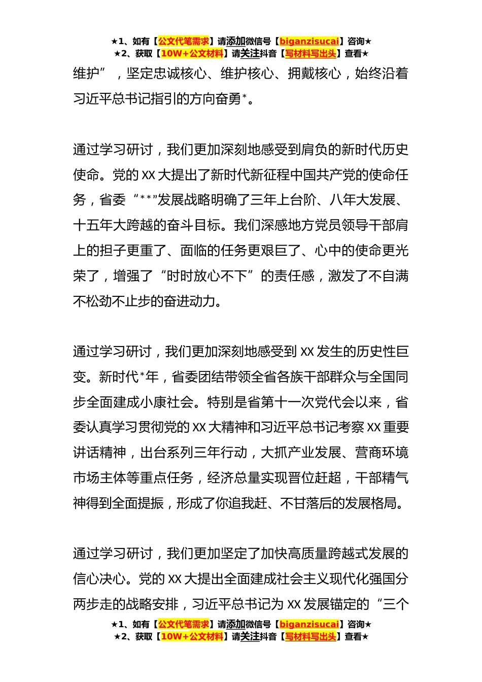 ★1、如有【公文代笔需求】请添加微信号【biganzisucai】咨询★★2、获取【10W+公文材料】请关注抖音【写材料写出头】查看★**关于XX大精神专题研讨班发言材料在全省上下深入学习贯彻党的XX大精神的关键时刻,中共XX省委举办这次专题研讨班,充分体现了省委高度的政治自觉、强烈的政治使命和坚定的政治担当。培训期间,各位老师的精彩讲授,让我们增长了知识、拓宽了思路、提振了信心、激发了斗志。特别是省委书记XX的主题报告,通篇贯彻习近平新时代中国特色社会主义思想和党的XX大精神,贯彻中央经济工作会议和习近平总书记考察XX重要讲话精神,全面对标中央精神,紧密结合XX实际,聚焦短板弱项,抓住重点关键,是一堂生动的理论解读课、一堂系统的形势分析课、一堂务实的发展部署课,让我们深受启发、备受鼓舞...