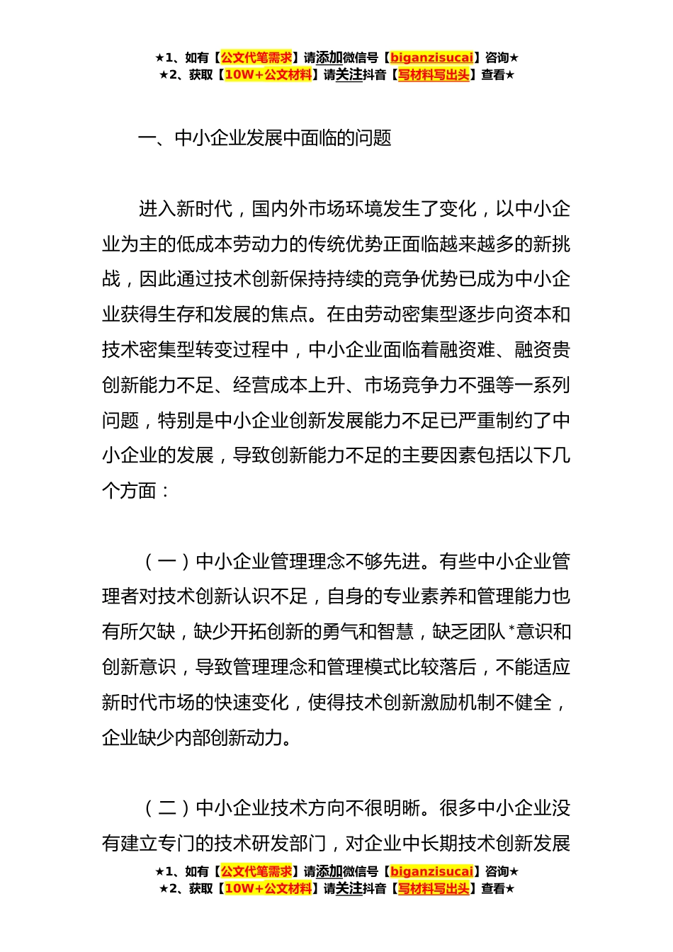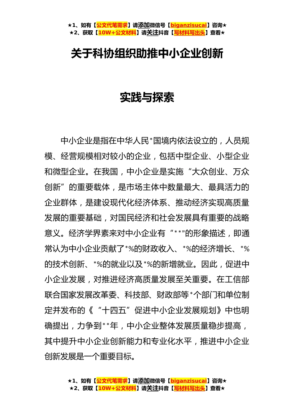 ★1、如有【公文代笔需求】请添加微信号【biganzisucai】咨询★★2、获取【10W+公文材料】请关注抖音【写材料写出头】查看★关于科协组织助推中小企业创新实践与探索中小企业是指在中华人民*国境内依法设立的,人员规模、经营规模相对较小的企业,包括中型企业、小型企业和微型企业。在我国,中小企业是实施“大众创业、万众创新”的重要载体,是市场主体中数量最大、最具活力的企业群体,是建设现代化经济体系、推动经济实现高质量发展的重要基础,对国民经济和社会发展具有重要的战略意义。经济学界素来对中小企业有“**”的形象描述,即通常认为中小企业贡献了*%的财政收入、*%的经济增长、*%的技术创新、*%的就业以及*%的新增就业。因此,促进中小企业发展,对推进经济高质量发展至关重要。在工信部联合国家发...