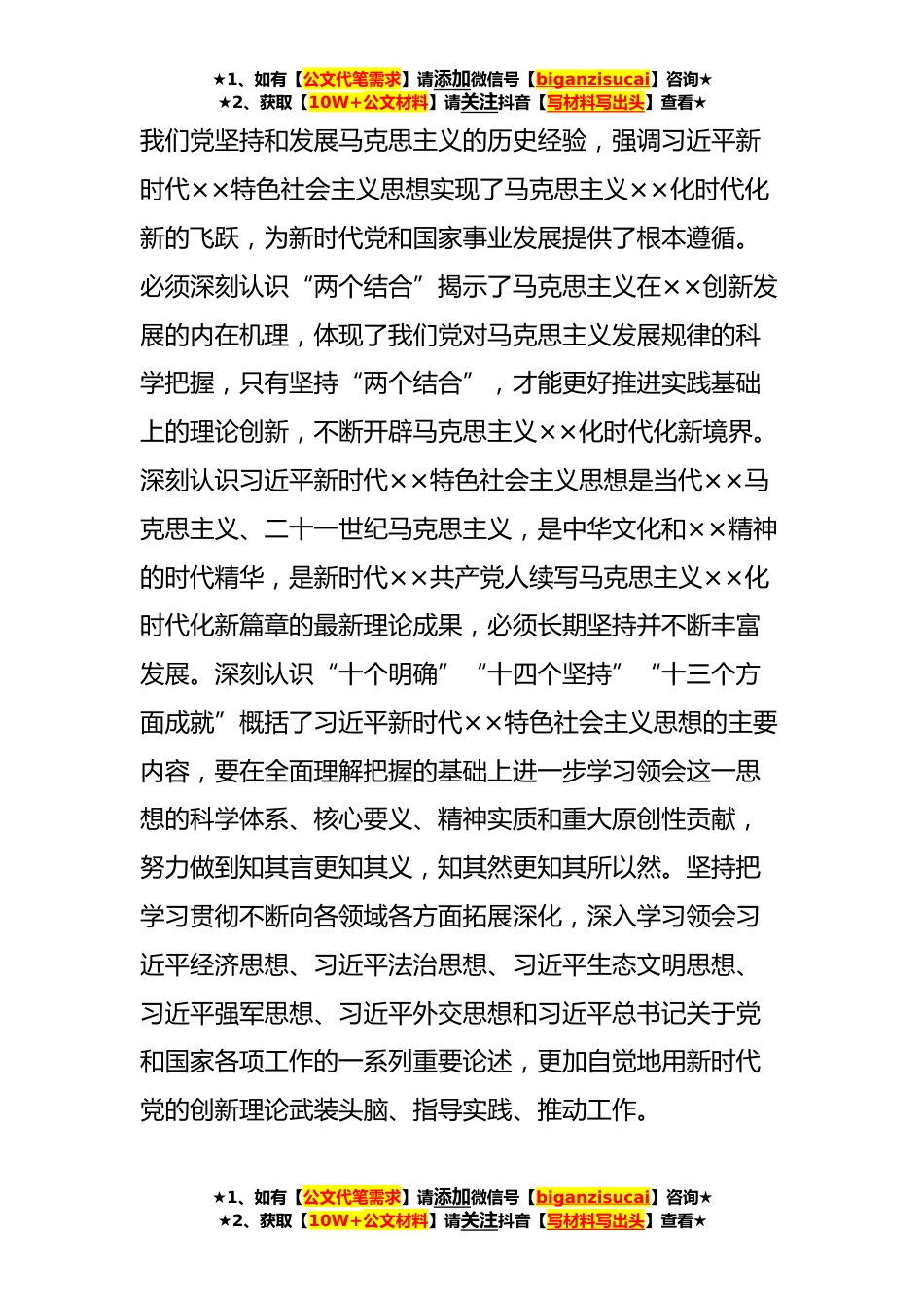 ★1、如有【公文代笔需求】请添加微信号【biganzisucai】咨询★★2、获取【10W+公文材料】请关注抖音【写材料写出头】查看★党委理论学习中心组专题学习内容安排一、深刻领悟“两个确立”的决定性意义。党的XX大强调,“两个确立”是党在新时代取得的重大政治成果,是推动党和国家事业取得历史性成就、发生历史性变革的决定性因素,对新时代党和国家事业发展、对推进中华民族伟大*历史进程具有决定性意义。必须深刻认识新时代*年的伟大变革,根本在于有习近平总书记作为党中央的核心、全党的核心掌舵领航,在于有习近平新时代××特色社会主义思想科学指引。深刻认识“两个确立”已经成为全党全军全国各族人民的高度共识和共同意志,已经写在了新时代的伟大征程中、写在了全党全军全国各族人民心坎上,是党应对一...