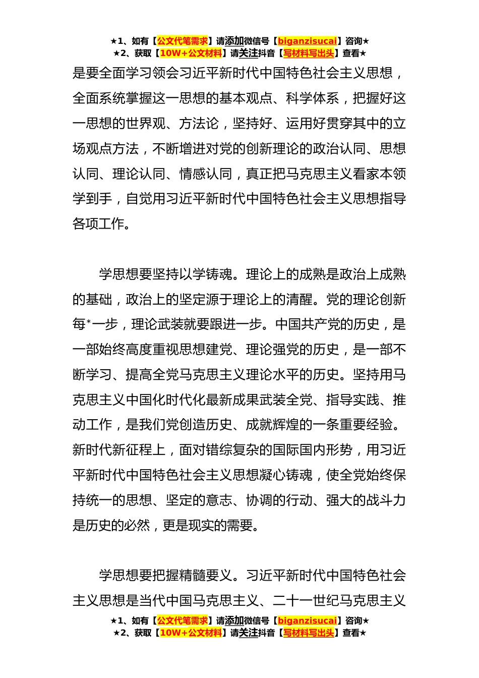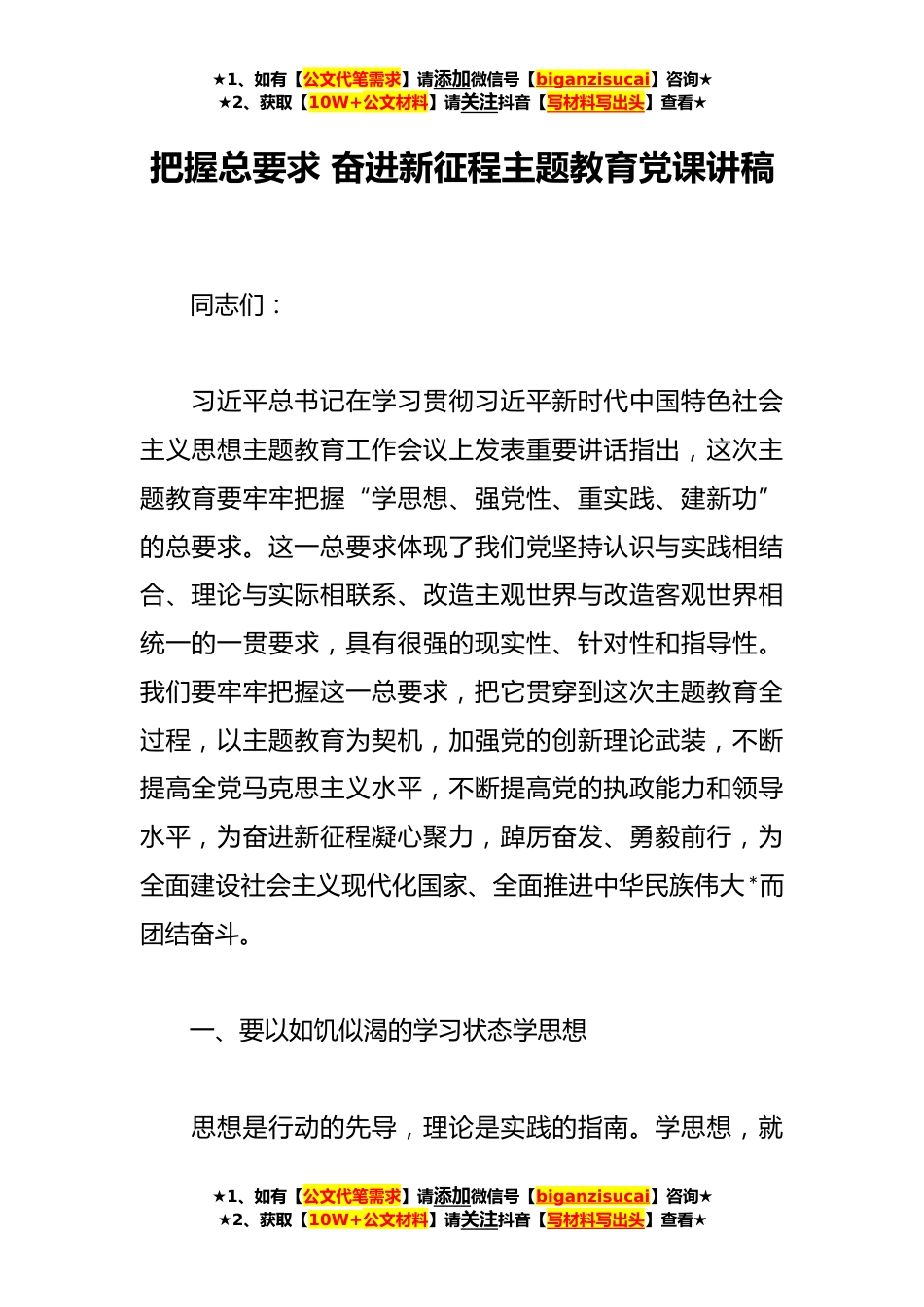 ★1、如有【公文代笔需求】请添加微信号【biganzisucai】咨询★★2、获取【10W+公文材料】请关注抖音【写材料写出头】查看★把握总要求奋进新征程主题教育党课讲稿同志们:习近平总书记在学习贯彻习近平新时代中国特色社会主义思想主题教育工作会议上发表重要讲话指出,这次主题教育要牢牢把握“学思想、强党性、重实践、建新功”的总要求。这一总要求体现了我们党坚持认识与实践相结合、理论与实际相联系、改造主观世界与改造客观世界相统一的一贯要求,具有很强的现实性、针对性和指导性。我们要牢牢把握这一总要求,把它贯穿到这次主题教育全过程,以主题教育为契机,加强党的创新理论武装,不断提高全党马克思主义水平,不断提高党的执政能力和领导水平,为奋进新征程凝心聚力,踔厉奋发、勇毅前行,为全面建...