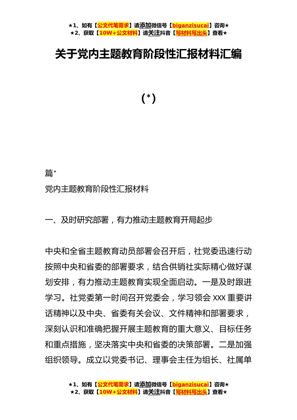 ★1、如有【公文代笔需求】请添加微信号【biganzisucai】咨询★★2、获取【10W+公文材料】请关注抖音【写材料写出头】查看★关于党内主题教育阶段性汇报材料汇编(*)篇*党内主题教育阶段性汇报材料一、及时研究部署,有力推动主题教育开局起步中央和全省主题教育动员部署会召开后,社党委迅速行动按照中央和省委的部署要求,结合供销社实际精心做好谋划安排,有力推动主题教育实现全面启动。一是及时跟进学习。社党委第一时间召开党委会,学习领会XXX重要讲话精神以及中央、省委有关会议、文件精神和部署要求,深刻认识和准确把握开展主题教育的重大意义、目标任务和重点措施,坚决落实中央和省委的决策部署。二是加强组织领导。成立以党委书记、理事会主任为组长、社属单★1、如有【公文代笔需求】请添加微信号...