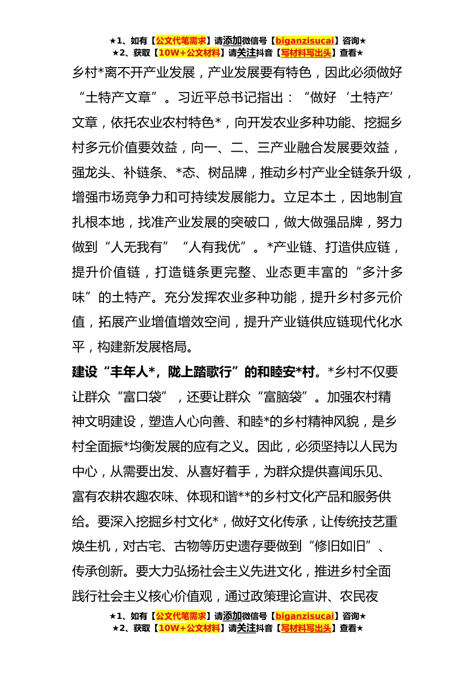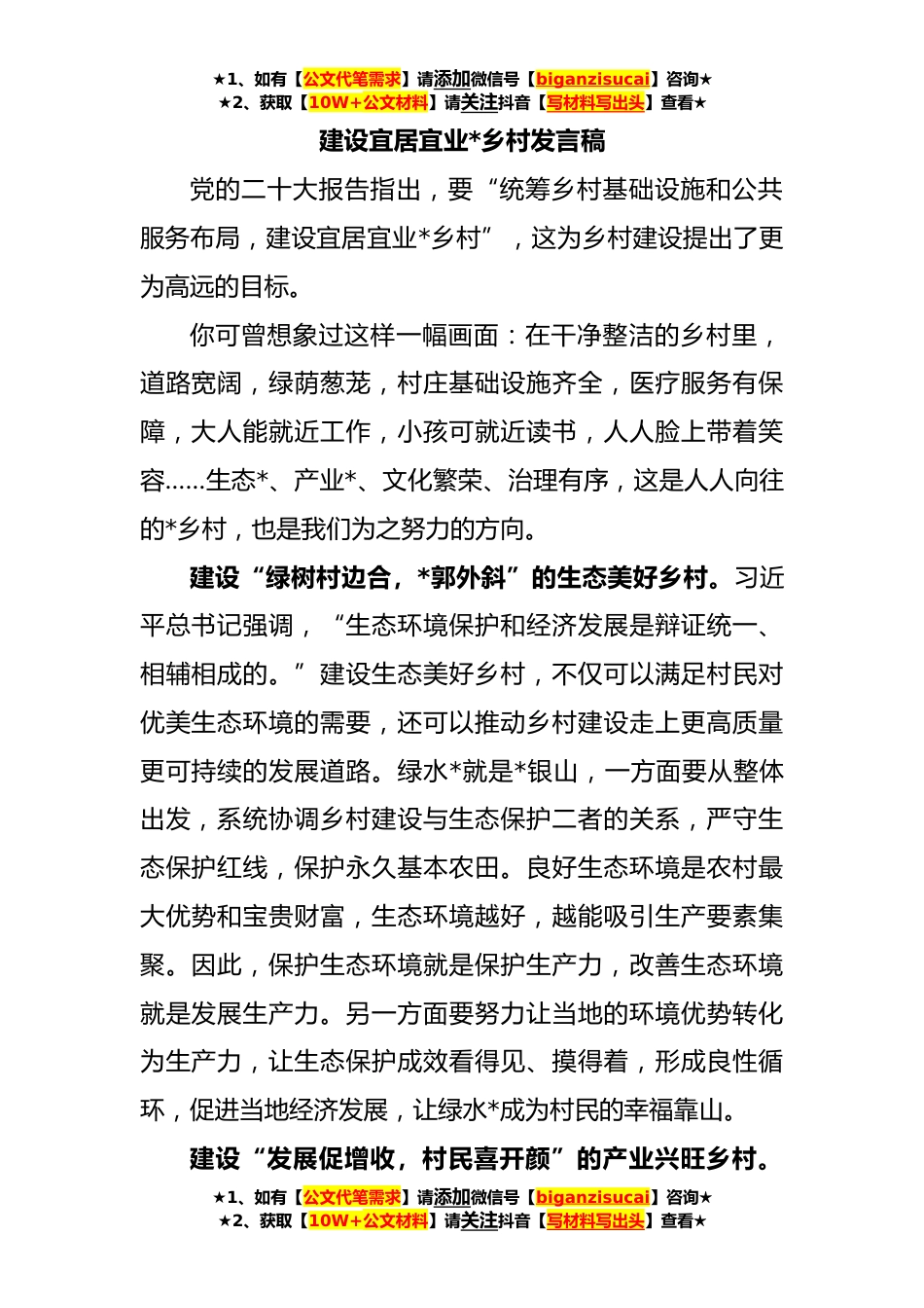 ★1、如有【公文代笔需求】请添加微信号【biganzisucai】咨询★★2、获取【10W+公文材料】请关注抖音【写材料写出头】查看★建设宜居宜业*乡村发言稿党的二十大报告指出,要“统筹乡村基础设施和公共服务布局,建设宜居宜业*乡村”,这为乡村建设提出了更为高远的目标。你可曾想象过这样一幅画面:在干净整洁的乡村里,道路宽阔,绿荫葱茏,村庄基础设施齐全,医疗服务有保障,大人能就近工作,小孩可就近读书,人人脸上带着笑容……生态*、产业*、文化繁荣、治理有序,这是人人向往的*乡村,也是我们为之努力的方向。建设“绿树村边合,*郭外斜”的生态美好乡村。习近平总书记强调,“生态环境保护和经济发展是辩证统一、相辅相成的。”建设生态美好乡村,不仅可以满足村民对优美生态环境的需要,还可以推动乡村...