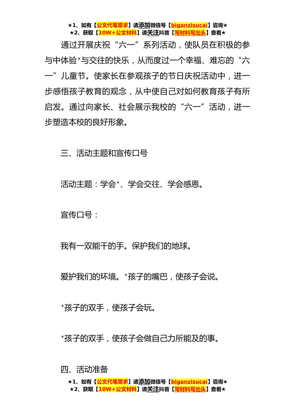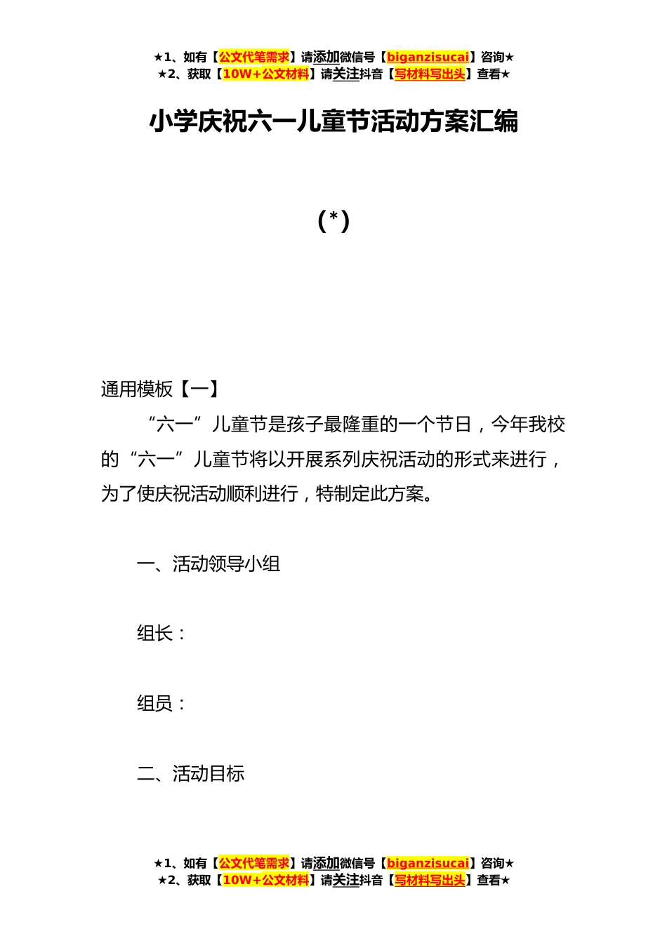 ★1、如有【公文代笔需求】请添加微信号【biganzisucai】咨询★★2、获取【10W+公文材料】请关注抖音【写材料写出头】查看★小学庆祝六一儿童节活动方案汇编(*)通用模板【一】“六一”儿童节是孩子最隆重的一个节日,今年我校的“六一”儿童节将以开展系列庆祝活动的形式来进行,为了使庆祝活动顺利进行,特制定此方案。一、活动领导小组组长:组员:二、活动目标★1、如有【公文代笔需求】请添加微信号【biganzisucai】咨询★★2、获取【10W+公文材料】请关注抖音【写材料写出头】查看★★1、如有【公文代笔需求】请添加微信号【biganzisucai】咨询★★2、获取【10W+公文材料】请关注抖音【写材料写出头】查看★通过开展庆祝“六一”系列活动,使队员在积极的参与中体验*与交往的快乐,从而度过一个幸福、难忘...