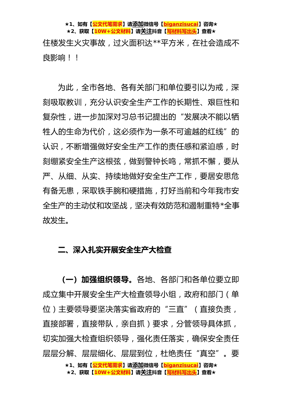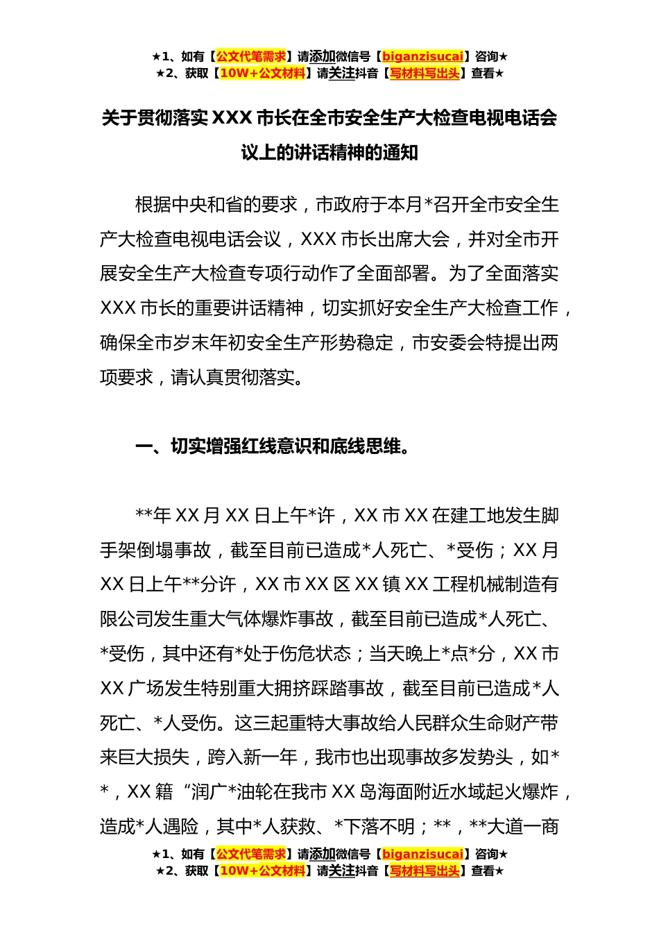 ★1、如有【公文代笔需求】请添加微信号【biganzisucai】咨询★★2、获取【10W+公文材料】请关注抖音【写材料写出头】查看★关于贯彻落实XXX市长在全市安全生产大检查电视电话会议上的讲话精神的通知根据中央和省的要求,市政府于本月*召开全市安全生产大检查电视电话会议,XXX市长出席大会,并对全市开展安全生产大检查专项行动作了全面部署。为了全面落实XXX市长的重要讲话精神,切实抓好安全生产大检查工作,确保全市岁末年初安全生产形势稳定,市安委会特提出两项要求,请认真贯彻落实。一、切实增强红线意识和底线思维。**年XX月XX日上午*许,XX市XX在建工地发生脚手架倒塌事故,截至目前已造成*人死亡、*受伤;XX月XX日上午**分许,XX市XX区XX镇XX工程机械制造有限公司发生重大气体爆炸事故,截至目前已造成...
