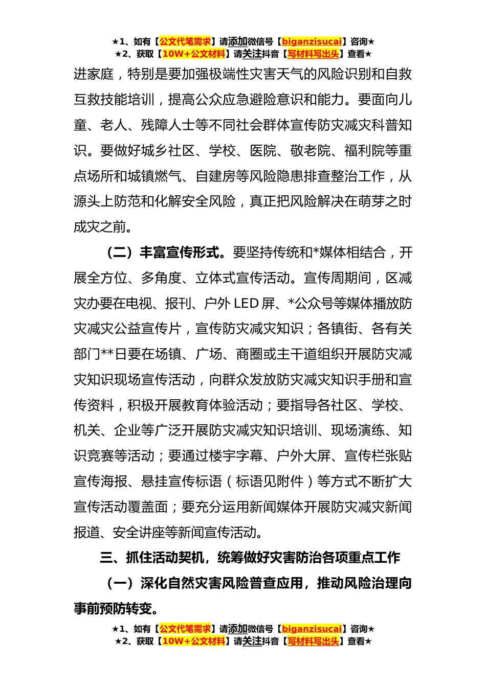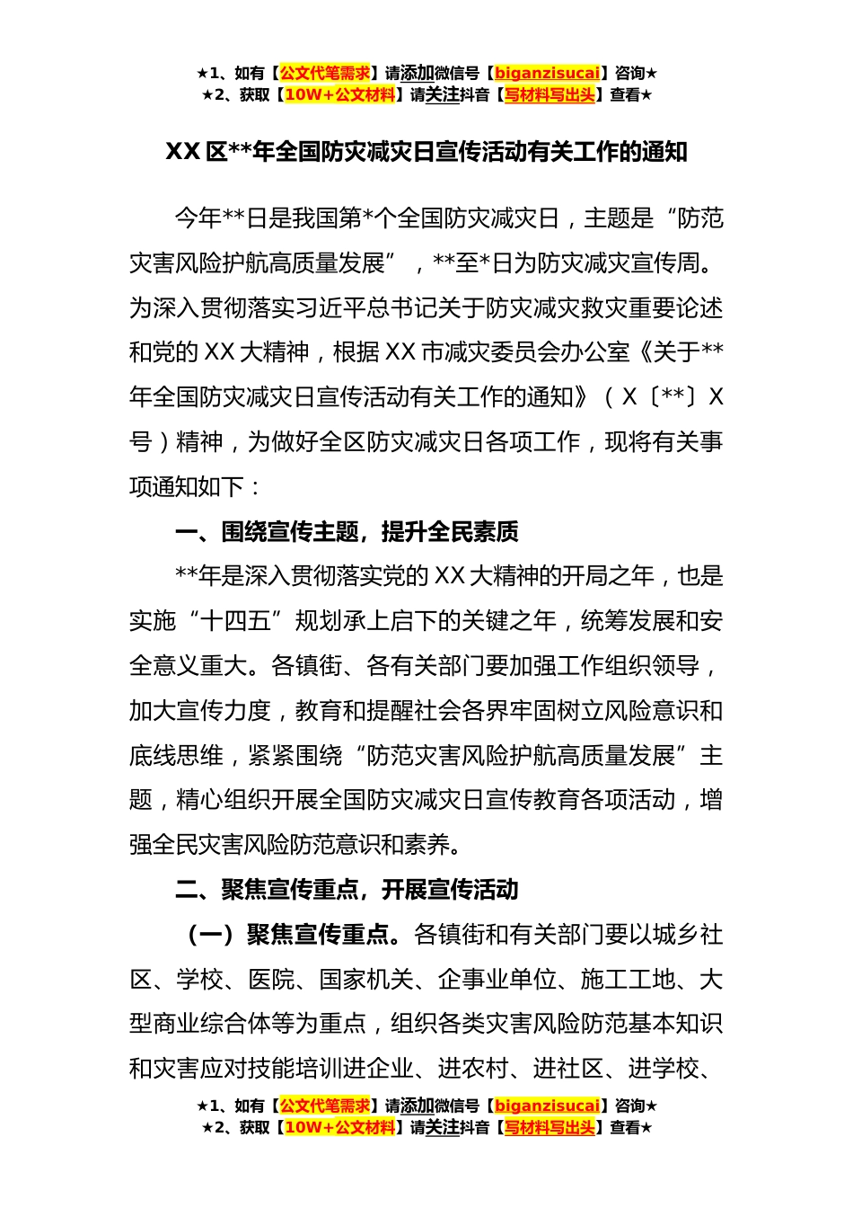 ★1、如有【公文代笔需求】请添加微信号【biganzisucai】咨询★★2、获取【10W+公文材料】请关注抖音【写材料写出头】查看★XX区**年全国防灾减灾日宣传活动有关工作的通知今年**日是我国第*个全国防灾减灾日,主题是“防范灾害风险护航高质量发展”,**至*日为防灾减灾宣传周。为深入贯彻落实习近平总书记关于防灾减灾救灾重要论述和党的XX大精神,根据XX市减灾委员会办公室《关于**年全国防灾减灾日宣传活动有关工作的通知》(X〔**〕X号)精神,为做好全区防灾减灾日各项工作,现将有关事项通知如下:一、围绕宣传主题,提升全民素质**年是深入贯彻落实党的XX大精神的开局之年,也是实施“十四五”规划承上启下的关键之年,统筹发展和安全意义重大。各镇街、各有关部门要加强工作组织领导,加大宣传力度,教育...