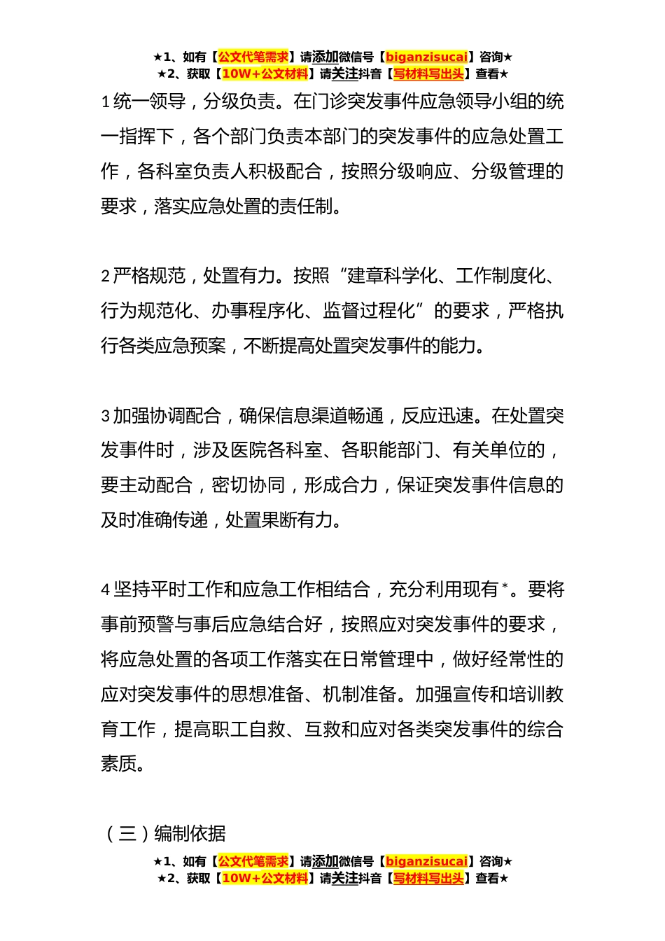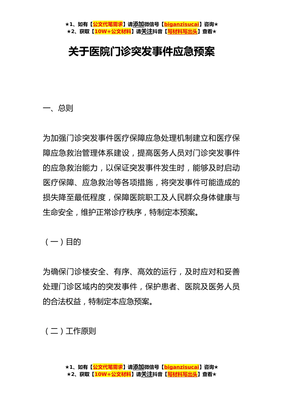 ★1、如有【公文代笔需求】请添加微信号【biganzisucai】咨询★★2、获取【10W+公文材料】请关注抖音【写材料写出头】查看★关于医院门诊突发事件应急预案一、总则为加强门诊突发事件医疗保障应急处理机制建立和医疗保障应急救治管理体系建设,提高医务人员对门诊突发事件的应急救治能力,以保证突发事件发生时,能够及时启动医疗保障、应急救治等各项措施,将突发事件可能造成的损失降至最低程度,保障医院职工及人民群众身体健康与生命安全,维护正常诊疗秩序,特制定本预案。(一)目的为确保门诊楼安全、有序、高效的运行,及时应对和妥善处理门诊区域内的突发事件,保护患者、医院及医务人员的合法权益,特制定本应急预案。(二)工作原则★1、如有【公文代笔需求】请添加微信号【biganzisucai】咨询★★2、...