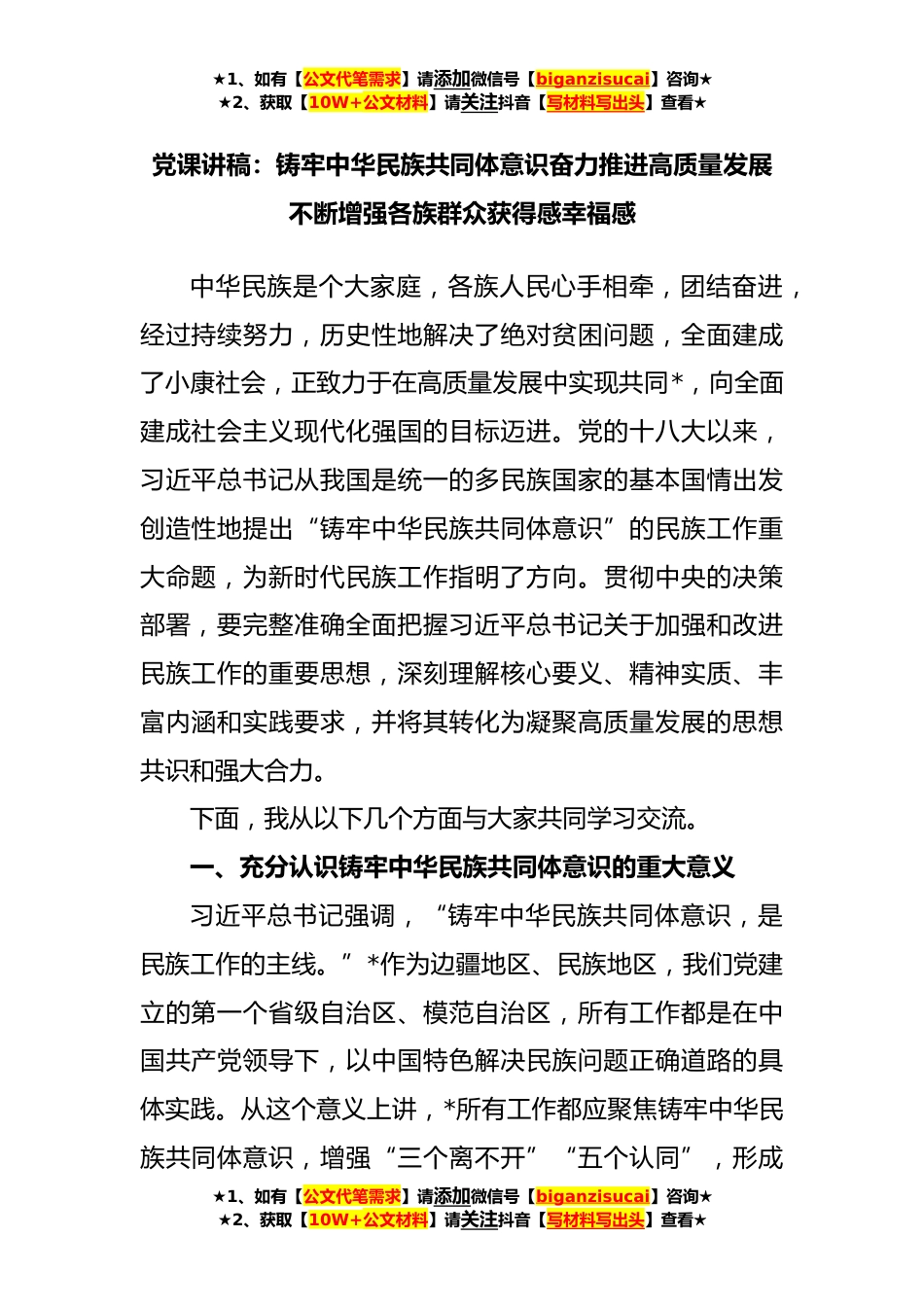 ★1、如有【公文代笔需求】请添加微信号【biganzisucai】咨询★★2、获取【10W+公文材料】请关注抖音【写材料写出头】查看★党课讲稿:铸牢中华民族共同体意识奋力推进高质量发展不断增强各族群众获得感幸福感中华民族是个大家庭,各族人民心手相牵,团结奋进,经过持续努力,历史性地解决了绝对贫困问题,全面建成了小康社会,正致力于在高质量发展中实现共同*,向全面建成社会主义现代化强国的目标迈进。党的十八大以来,习近平总书记从我国是统一的多民族国家的基本国情出发创造性地提出“铸牢中华民族共同体意识”的民族工作重大命题,为新时代民族工作指明了方向。贯彻中央的决策部署,要完整准确全面把握习近平总书记关于加强和改进民族工作的重要思想,深刻理解核心要义、精神实质、丰富内涵和实践要求,并...