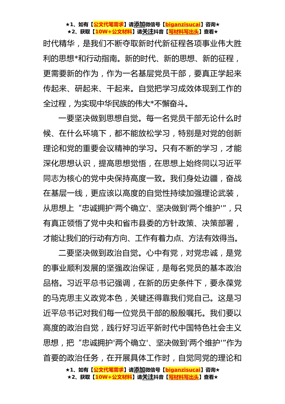 ★1、如有【公文代笔需求】请添加微信号【biganzisucai】咨询★★2、获取【10W+公文材料】请关注抖音【写材料写出头】查看★专题党课:新思想指引新实践新作为开启新征程同志们:一个民族要走在时代前列,就一刻不能没有理论思维,一刻不能没有正确思想指引。党的十八大以来,习近平总书记以马克思主义政治家、思想家、战略家的非凡理论勇气、卓越政治智慧、强烈使命担当,对关系新时代党和国家事业发展的一系列重*论和重大实践问题进行了深邃思考和科学判断,形成了习近平新时代中国特色社会主义思想这一当代中国马克思主义、二十一世纪马克思主义。习近平新时代中国特色社会主义思想是中华文化和中国精神的时代精华,指引我们在非凡十年中取得历史性成就、实现历史性变革,也必将指引我们在奋进新征程上夺取新的...