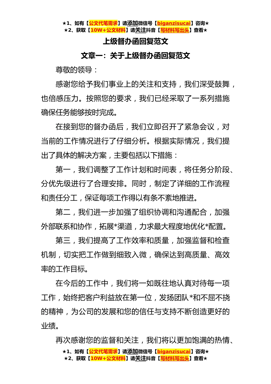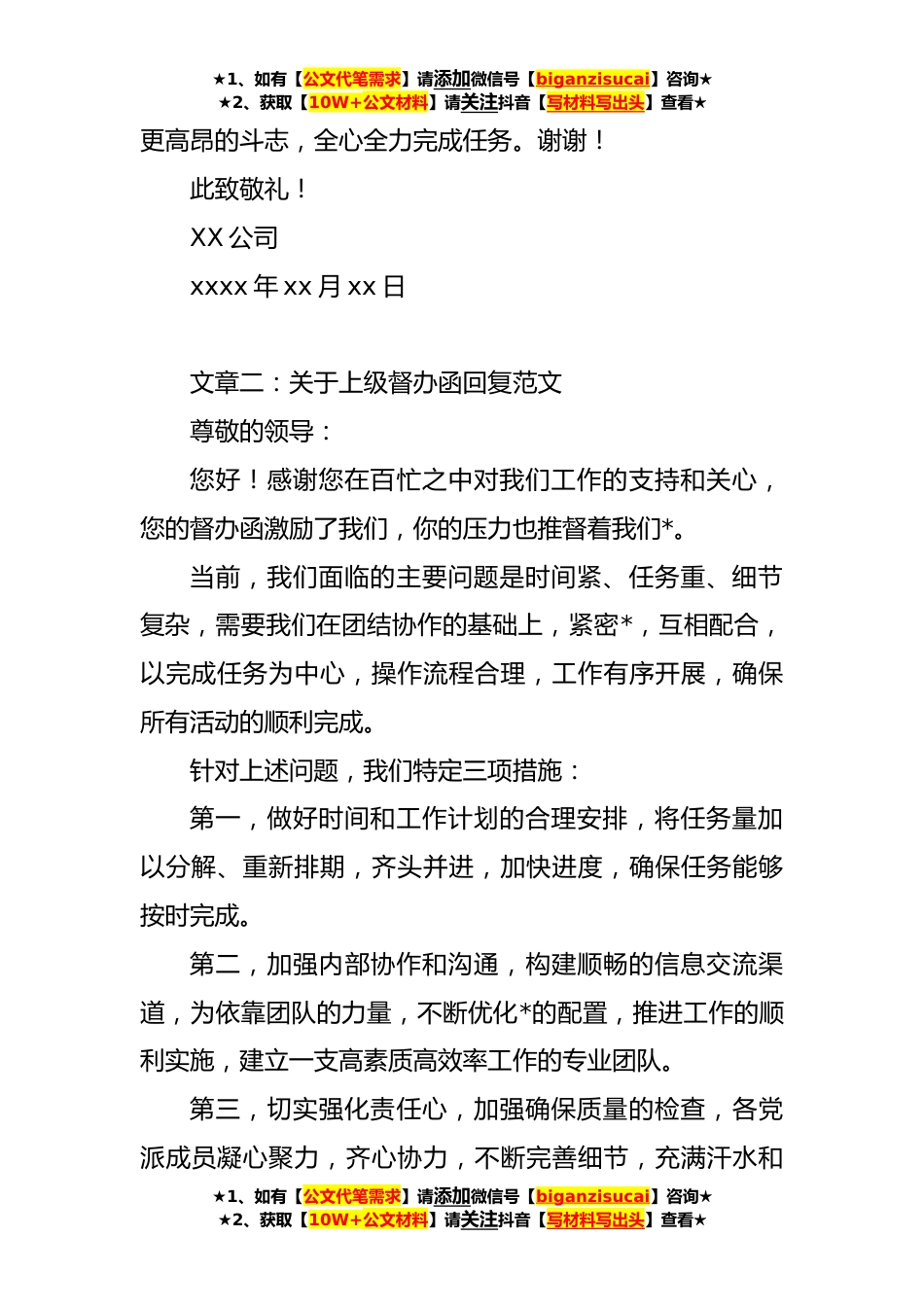 ★1、如有【公文代笔需求】请添加微信号【biganzisucai】咨询★★2、获取【10W+公文材料】请关注抖音【写材料写出头】查看★上级督办函回复范文文章一:关于上级督办函回复范文尊敬的领导:感谢您给予我们事业上的关注和支持,我们深受鼓舞,也倍感压力。按照您的要求,我们已经采取了一系列措施确保任务能够按时完成。在接到您的督办函后,我们立即召开了紧急会议,对当前的工作情况进行了仔细分析。根据实际情况,我们提出了具体的解决方案,主要包括以下措施:第一,我们调整了工作计划和时间表,将任务分阶段、分优先级进行了合理安排。同时,制定了详细的工作流程和责任分工,保证每项工作得以有条不紊地推进。第二,我们进一步加强了组织协调和沟通配合,加强外部联系和协作,拓展*渠道,力求最大程度地优化...