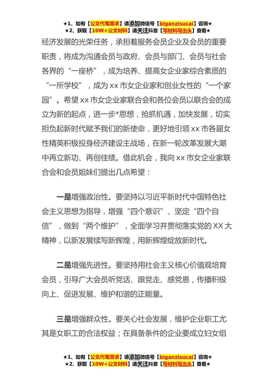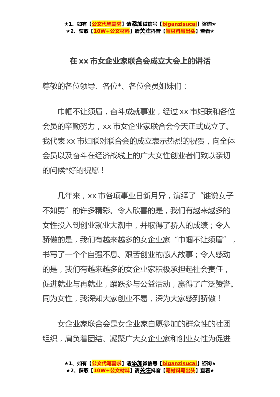 ★1、如有【公文代笔需求】请添加微信号【biganzisucai】咨询★★2、获取【10W+公文材料】请关注抖音【写材料写出头】查看★在xx市女企业家联合会成立大会上的讲话尊敬的各位领导、各位*、各位会员姐妹们:巾帼不让须眉,奋斗成就事业,经过xx市妇联和各位会员的辛勤努力,xx市女企业家联合会今天正式成立了。我代表xx市妇联对联合会的成立表示热烈的祝贺,向全体会员以及奋斗在经济战线上的广大女性创业者们致以亲切的问候*好的祝愿!几年来,xx市各项事业日新月异,演绎了“谁说女子不如男”的许多精彩。令人欣喜的是,我们有越来越多的女性投入到创业就业大潮中,并取得了骄人的成绩;令人骄傲的是,我们有越来越多的女企业家“巾帼不让须眉”,书写了一个个自强不息、艰苦创业的感人故事;令人感动的是,我们...