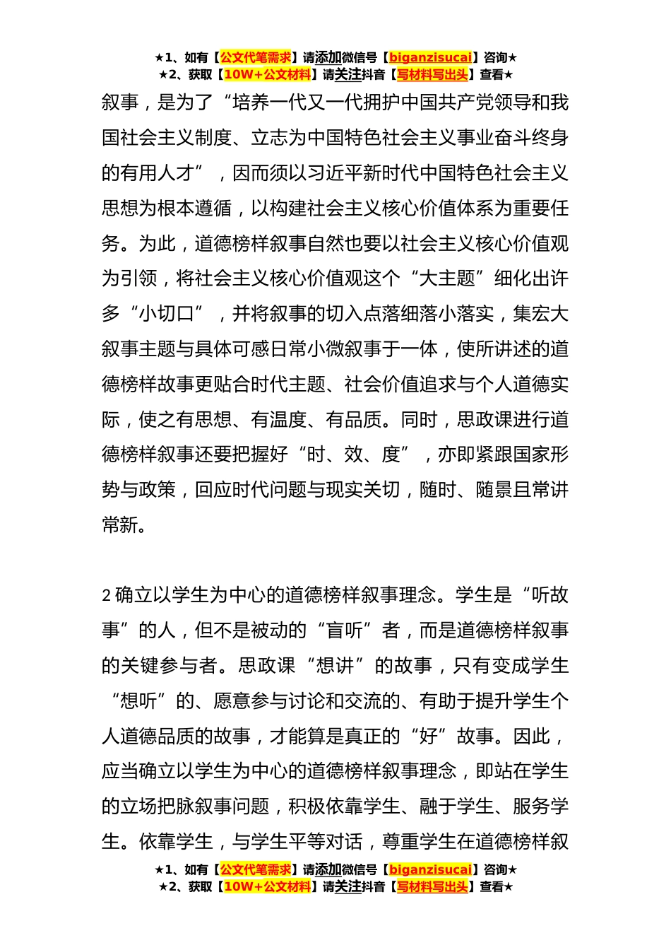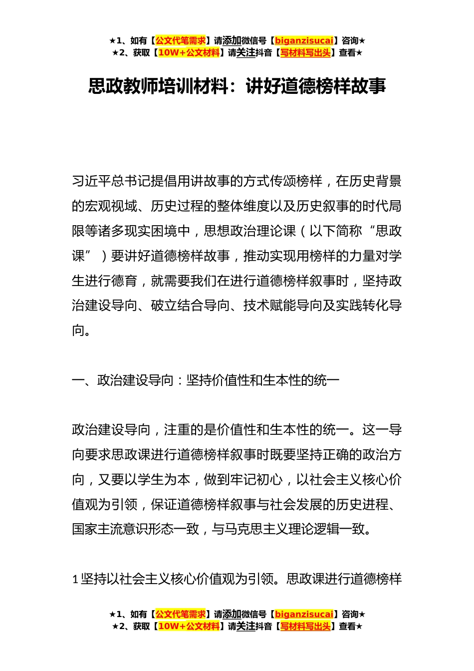 ★1、如有【公文代笔需求】请添加微信号【biganzisucai】咨询★★2、获取【10W+公文材料】请关注抖音【写材料写出头】查看★思政教师培训材料:讲好道德榜样故事习近平总书记提倡用讲故事的方式传颂榜样,在历史背景的宏观视域、历史过程的整体维度以及历史叙事的时代局限等诸多现实困境中,思想政治理论课(以下简称“思政课”)要讲好道德榜样故事,推动实现用榜样的力量对学生进行德育,就需要我们在进行道德榜样叙事时,坚持政治建设导向、破立结合导向、技术赋能导向及实践转化导向。一、政治建设导向:坚持价值性和生本性的统一政治建设导向,注重的是价值性和生本性的统一。这一导向要求思政课进行道德榜样叙事时既要坚持正确的政治方向,又要以学生为本,做到牢记初心,以社会主义核心价值观为引领,保证...