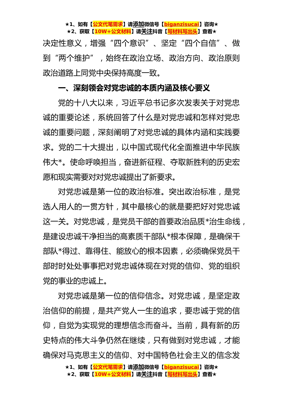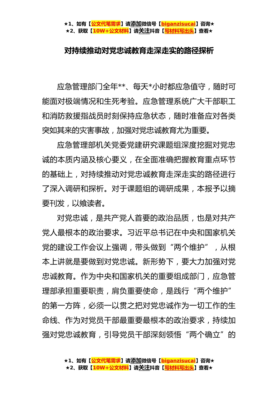 ★1、如有【公文代笔需求】请添加微信号【biganzisucai】咨询★★2、获取【10W+公文材料】请关注抖音【写材料写出头】查看★对持续推动对党忠诚教育走深走实的路径探析应急管理部门全年**、每天*小时都应急值守,随时可能面对极端情况和生死考验。应急管理系统广大干部职工和消防救援指战员时刻保持应急状态,随时准备应对各类突如其来的灾害事故,加强对党忠诚教育尤为重要。应急管理部机关党委党建研究课题组深度挖掘对党忠诚的本质内涵及核心要义,在全面准确把握教育重点环节的基础上,对持续推动对党忠诚教育走深走实的路径进行了深入调研和探析。对于课题组的调研成果,本报予以摘要刊发,以飨读者。对党忠诚,是共产党人首要的政治品质,也是对共产党人最根本的政治要求。习近平总书记在中央和国家机关党的...