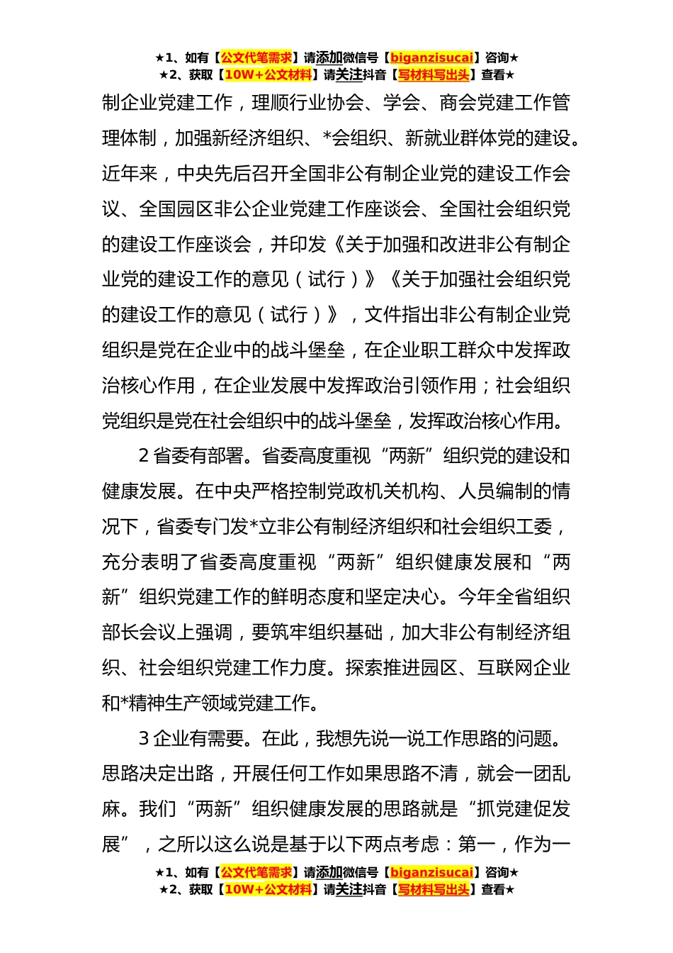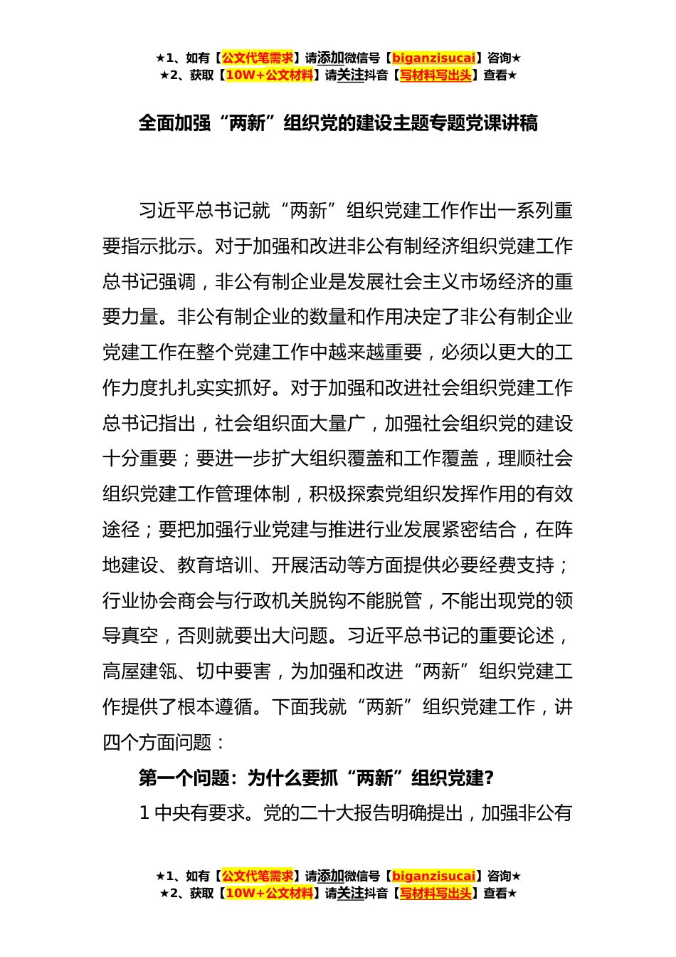 ★1、如有【公文代笔需求】请添加微信号【biganzisucai】咨询★★2、获取【10W+公文材料】请关注抖音【写材料写出头】查看★全面加强“两新”组织党的建设主题专题党课讲稿习近平总书记就“两新”组织党建工作作出一系列重要指示批示。对于加强和改进非公有制经济组织党建工作总书记强调,非公有制企业是发展社会主义市场经济的重要力量。非公有制企业的数量和作用决定了非公有制企业党建工作在整个党建工作中越来越重要,必须以更大的工作力度扎扎实实抓好。对于加强和改进社会组织党建工作总书记指出,社会组织面大量广,加强社会组织党的建设十分重要;要进一步扩大组织覆盖和工作覆盖,理顺社会组织党建工作管理体制,积极探索党组织发挥作用的有效途径;要把加强行业党建与推进行业发展紧密结合,在阵地建设...