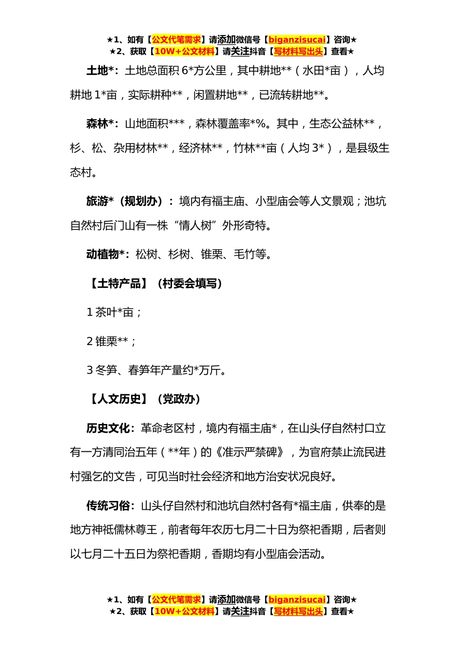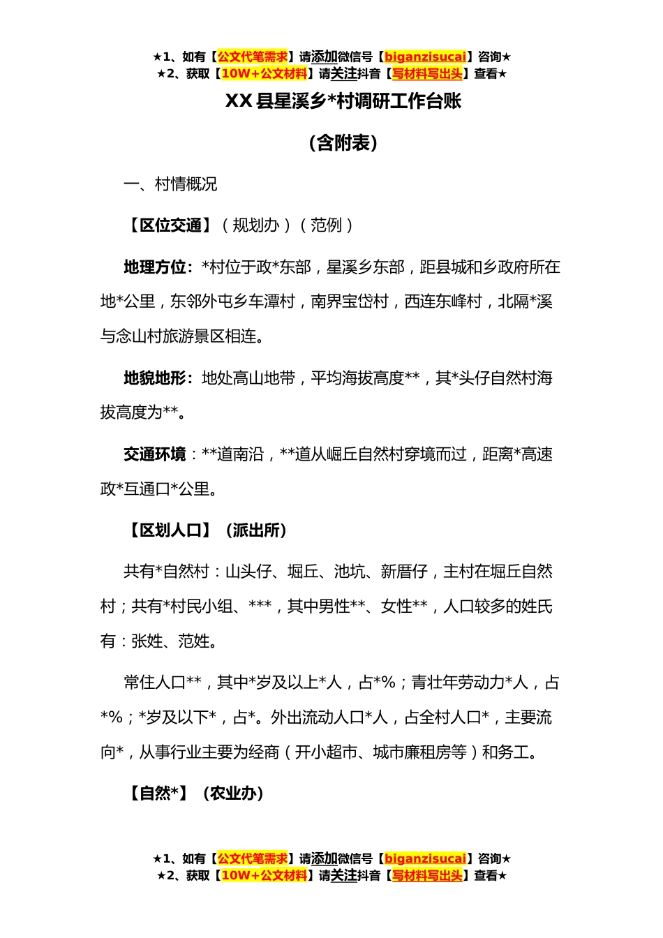 ★1、如有【公文代笔需求】请添加微信号【biganzisucai】咨询★★2、获取【10W+公文材料】请关注抖音【写材料写出头】查看★XX县星溪乡*村调研工作台账(含附表)一、村情概况【区位交通】(规划办)(范例)地理方位:*村位于政*东部,星溪乡东部,距县城和乡政府所在地*公里,东邻外屯乡车潭村,南界宝岱村,西连东峰村,北隔*溪与念山村旅游景区相连。地貌地形:地处高山地带,平均海拔高度**,其*头仔自然村海拔高度为**。交通环境:**道南沿,**道从崛丘自然村穿境而过,距离*高速政*互通口*公里。【区划人口】(派出所)共有*自然村:山头仔、堀丘、池坑、新厝仔,主村在堀丘自然村;共有*村民小组、***,其中男性**、女性**,人口较多的姓氏有:张姓、范姓。常住人口**,其中*岁及以上*人,占*%;青壮年劳...