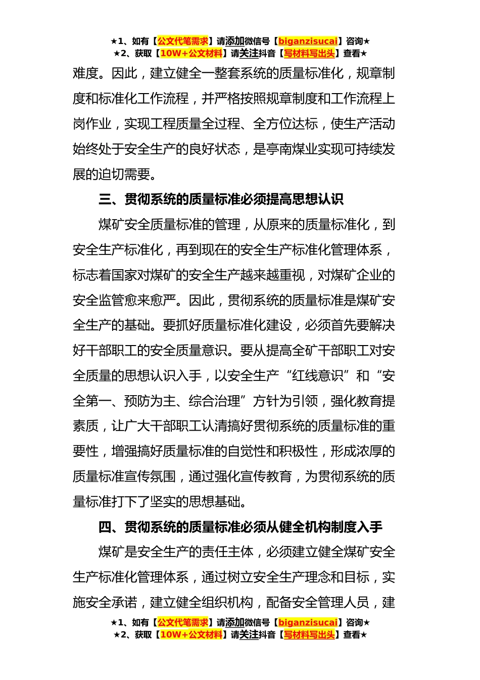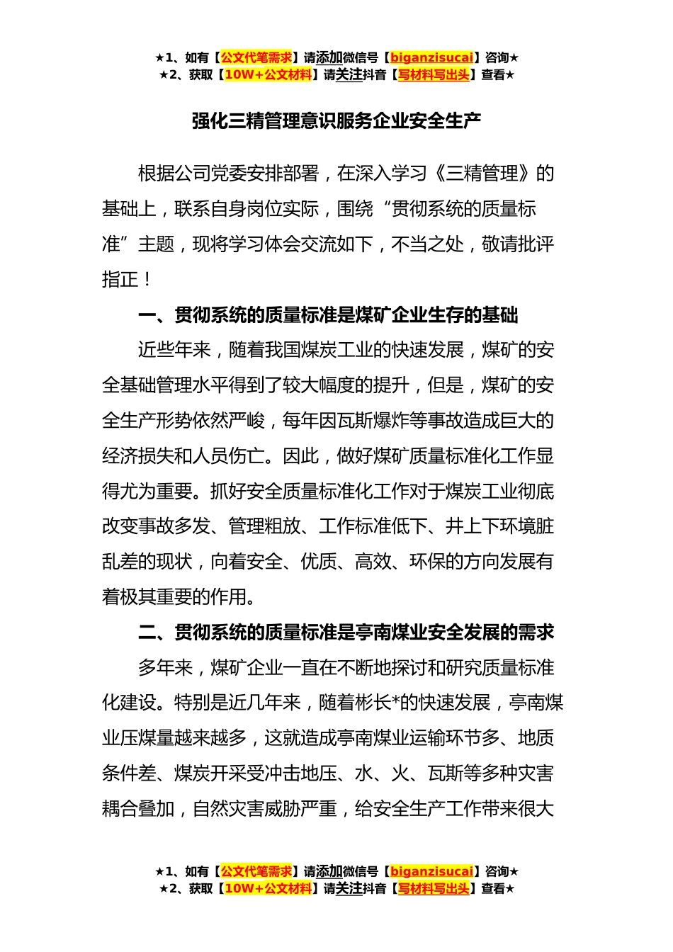 ★1、如有【公文代笔需求】请添加微信号【biganzisucai】咨询★★2、获取【10W+公文材料】请关注抖音【写材料写出头】查看★强化三精管理意识服务企业安全生产根据公司党委安排部署,在深入学习《三精管理》的基础上,联系自身岗位实际,围绕“贯彻系统的质量标准”主题,现将学习体会交流如下,不当之处,敬请批评指正!一、贯彻系统的质量标准是煤矿企业生存的基础近些年来,随着我国煤炭工业的快速发展,煤矿的安全基础管理水平得到了较大幅度的提升,但是,煤矿的安全生产形势依然严峻,每年因瓦斯爆炸等事故造成巨大的经济损失和人员伤亡。因此,做好煤矿质量标准化工作显得尤为重要。抓好安全质量标准化工作对于煤炭工业彻底改变事故多发、管理粗放、工作标准低下、井上下环境脏乱差的现状,向着安全、优质...